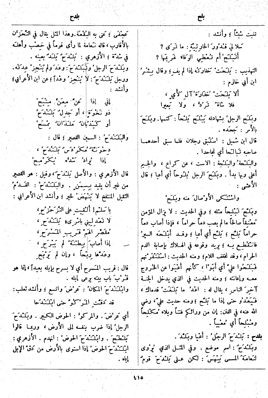 بلدح: بَلْدَحَ الرجُلُ: أَعْيا وبَلَّدَ. وبَلْدَحٌ: اسْمُ مَوْضِعٍ. وَفِي الْمَثَلِ الَّذِي يُرْوى لنَعامَةَ الْمُسَمَّى بَيْهَسَ: لَكِنَّ عَلَى بَلْدَحَ قومٌ عَجْفَى؛ عَنى بِهِ البُقْعَة. وَهَذَا الْمَثَلُ يُقَالُ فِي التَّحَزُّن بالأَقارب، قَالَهُ نَعامة لَمَّا رأَى قَوْمًا فِي خِصْب وأَهلَه فِي شِدَّةٍ؛ الأَزهري: بَلْدَحٌ بَلَدٌ بِعَيْنِهِ. وبَلْدَحَ الرجلُ وتَبَلْدَحَ: وعَدَ وَلَمْ يُنْجِزْ عِدَتَه. وَرَجُلٌ بَلَنْدَحٌ: لَا يُنْجِزُ وعْداً؛ عَنِ ابْنِ الأَعرابي؛ وأَنشد: