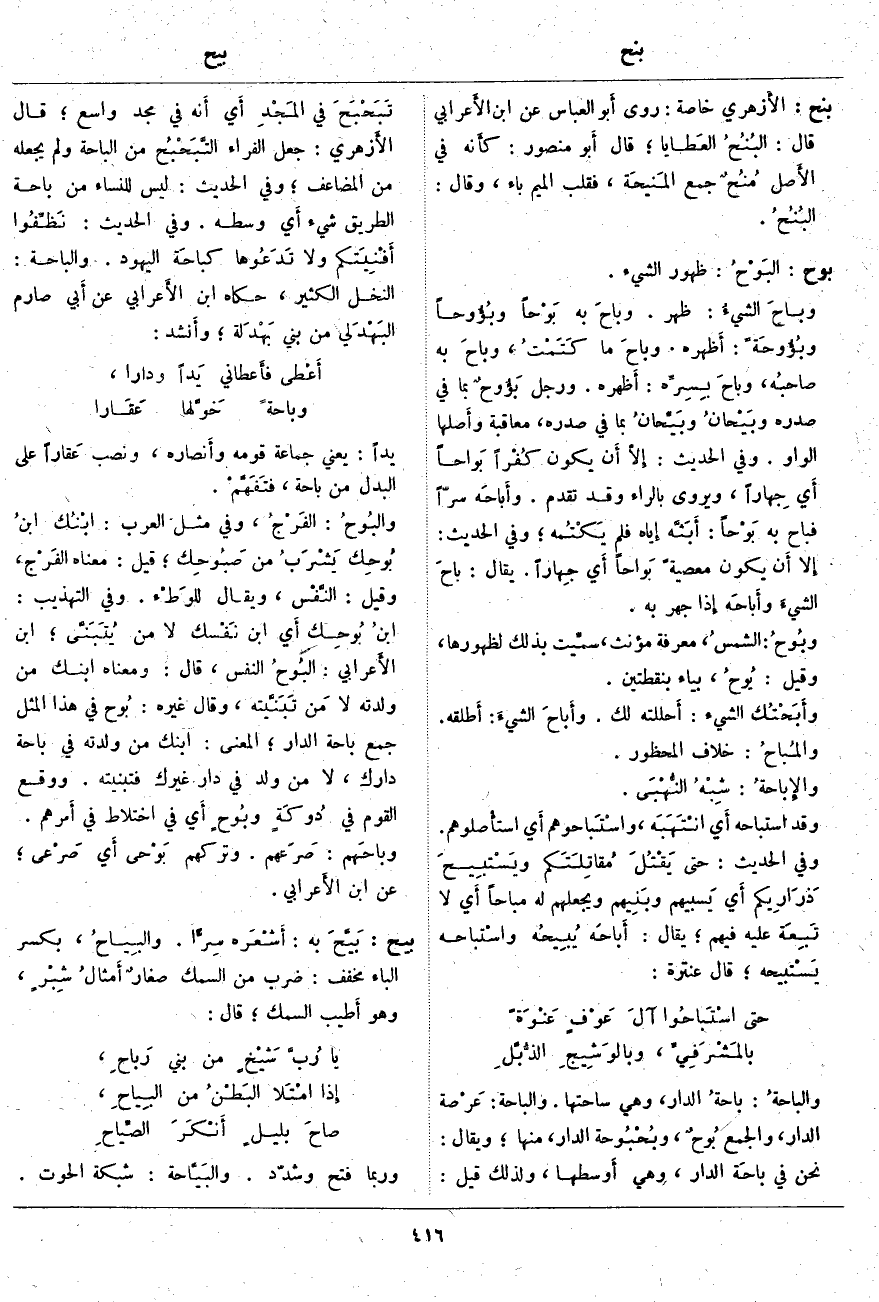 بوح: البَوْحُ: ظُهُورُ الشَّيْءِ. وباحَ الشيءُ: ظَهَرَ. وباحَ به بَوْحاً وبُؤُوحا وبُؤُوحَةً: أَظهره. وباحَ مَا كَتَمْتُ، وباحَ بِهِ صاحبُه، وباحَ بِسِرِّه: أَظهره. ورجل بَؤُوحٌ بِمَا فِي صَدْرِهِ وبَيْحانُ وبَيِّحانُ بِمَا فِي صَدْرِهِ، مُعَاقَبَةٌ وأَصلها الْوَاوُ. وَفِي الْحَدِيثِ: