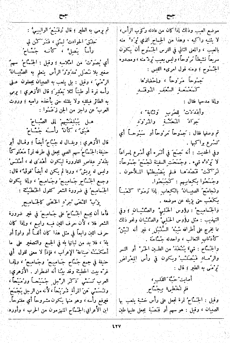فأَما أَن يُجْمَعَ الجُمَّاحُ عَلَى جَمامِحَ فِي غَيْرِ ضَرُورَةِ الشَّعْرِ فَلَا، لأَن حَرْفَ اللِّينِ فِيهِ رَابِعٌ، وإِذا كَانَ حَرْفُ اللِّينِ رَابِعًا فِي مِثْلِ هَذَا كَانَ أَلفاً أَو وَاوًا أَو يَاءً، فَلَا بُدَّ مِنْ ثَبَاتِهَا يَاءً فِي الْجَمْعِ وَالتَّصْغِيرِ عَلَى مَا أَحكَمَتْه صِناعةُ الإِعراب، فإِذاً لَا مَعْنَى لِقَوْلِ أَبي حَنِيفَةَ فِي جَمْعِ جُمَّاح جَمامِيحُ وجَمامِحُ، وإِنما غَرَّهُ بَيْتُ الْحُطَيْئَةِ وَقَدْ بيَّنا أَنه اضْطِرَارٌ. الأَزهري: الْعَرَبُ تُسَمِّي ذَكَر الرَّجلِ جُمَيْحاً ورُمَيْحاً، وتُسَمِّي هَنَ المرأَةِ شُرَيْحاً، لأَنه مِنَ الرَّجُلِ يَجْمَحُ فَيَرْفَعُ رأْسه، وَهُوَ مِنْهَا يَكُونُ مَشْرُوحًا أَي مَفْتُوحًا. ابْنُ الأَعرابي: الجُمَّاح الْمُنْهَزِمُونَ مِنَ الْحَرْبِ، وأَورد