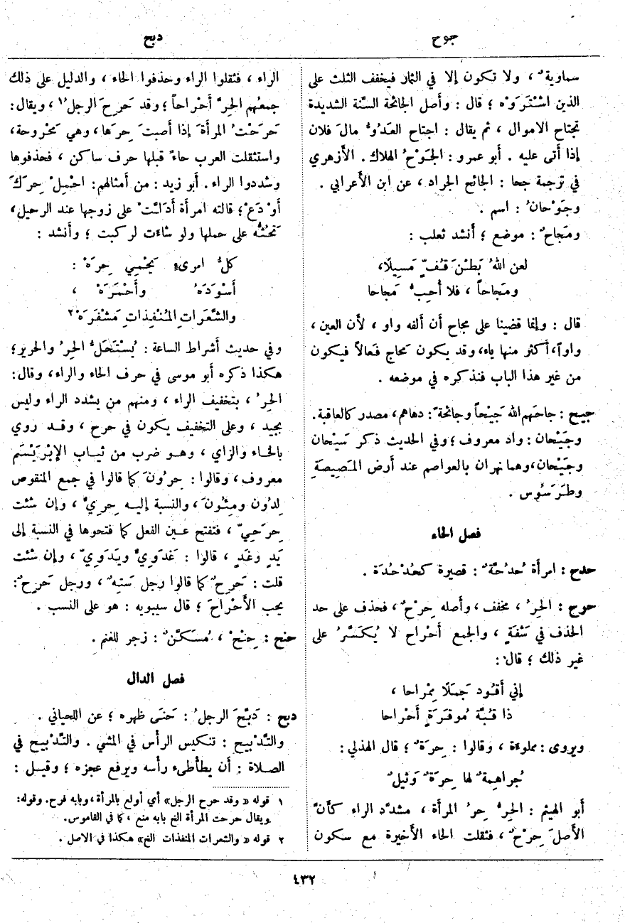 جيح: جاحَهم اللَّهُ جَيْحاً وَجَائِحَةً: دَهَاهُمْ، مَصْدَرٌ كَالْعَاقِبَةِ. وجَيْحان: وَادٍ مَعْرُوفٌ؛ وَفِي الْحَدِيثِ ذِكْرُ سَيْحان وجَيْحان، وَهُمَا نَهْرَانِ بِالْعَوَاصِمِ عِنْدَ أَرض المَصِيصَةِ وطَرَسُوس.