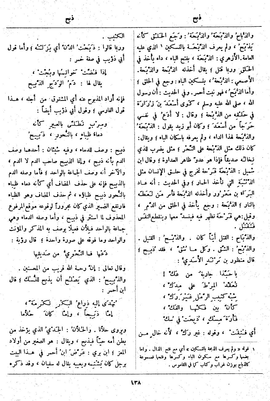 ذَبِيحٌ: وَصْفٌ لِلدِّمَاءِ، وَفِيهِ شَيْئَانِ: أَحدهما وَصْفُ الدَّمِ بأَنه ذَبِيحٌ، وإِنما الذَّبِيحُ صَاحِبُ الدَّمِ لَا الدَّمُ، وَالْآخِرُ أَنه وَصَفَ الْجَمَاعَةَ بِالْوَاحِدِ؛ فأَما وَصْفُهُ الدَّمَ بِالذَّبِيحِ فإِنه عَلَى حَذْفِ الْمُضَافِ أَي كأَنه دِمَاءُ ظِباء بالنُّحور ذبيح ظباؤُه، ثُمَّ حُذِفَ الْمُضَافُ وَهُوَ الظِّبَاءُ فَارْتَفَعَ الضَّمِيرُ الَّذِي كَانَ مَجْرُورًا لِوُقُوعِهِ مَوْقِعَ الْمَرْفُوعِ الْمَحْذُوفِ لِمَا اسْتَتَرَ فِي ذَبِيحٍ، وأَما وَصْفُهُ الدِّمَاءَ وَهِيَ جَمَاعَةٌ بِالْوَاحِدِ فلِأَن فَعِيلًا يُوصَفُ بِهِ الْمُذَكَّرُ والمؤَنث وَالْوَاحِدُ وَمَا فَوْقَهُ عَلَى صُورَةٍ وَاحِدَةٍ؛ قَالَ رُؤْبَةُ: