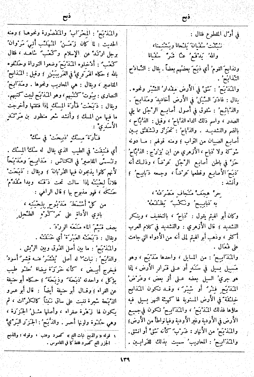 وَكَانَ أَبو الْهَيْثَمِ يَقُولُ: ذُباحٌ، بِالتَّخْفِيفِ، وَيُنْكِرُ التَّشْدِيدَ؛ قَالَ الأَزهري: وَالتَّشْدِيدُ فِي كَلَامِ الْعَرَبِ أَكثر، وَذَهَبَ أَبو الْهَيْثَمِ إِلى أَنه مِنَ الأَدواء الَّتِي جَاءَتْ عَلَى فُعَال. والمَذَابِحُ: مِنَ الْمَسَايِلِ، وَاحِدُهَا مَذْبَح، وَهُوَ مَسِيل يَسِيلُ فِي سَنَدٍ أَو عَلَى قَرارِ الأَرض، إِنما هُوَ جريُ السَّيْلِ بَعْضِهِ عَلَى أَثر بَعْضٍ، وعَرْضُ المَذْبَحِ فِتْرٌ أَو شِبْرٌ، وَقَدْ تَكُونُ المَذابح خِلْقَةً فِي الأَرض الْمُسْتَوِيَةِ لَهَا كَهَيْئَةِ النَّهْرِ يَسِيلُ فِيهِ ماؤُها فَذَلِكَ المَذْبَحُ، والمَذَابِحُ تَكُونُ فِي جَمِيعِ الأَرض فِي الأَودية وَغَيْرِ الأَودية وَفِيمَا تواطأَ مِنَ الأَرض؛ والمَذْبَحُ مِنَ الأَنهار: ضَرْبٌ كأَنه شَقٌّ أَو انْشَقَّ. والمَذَابِحُ: المحاريبُ سُمِّيَتْ بِذَلِكَ للقَرابين. والمَذْبَحُ: المِحْرَابُ والمَقْصُورة وَنَحْوُهُمَا؛ وَمِنْهُ الْحَدِيثُ: