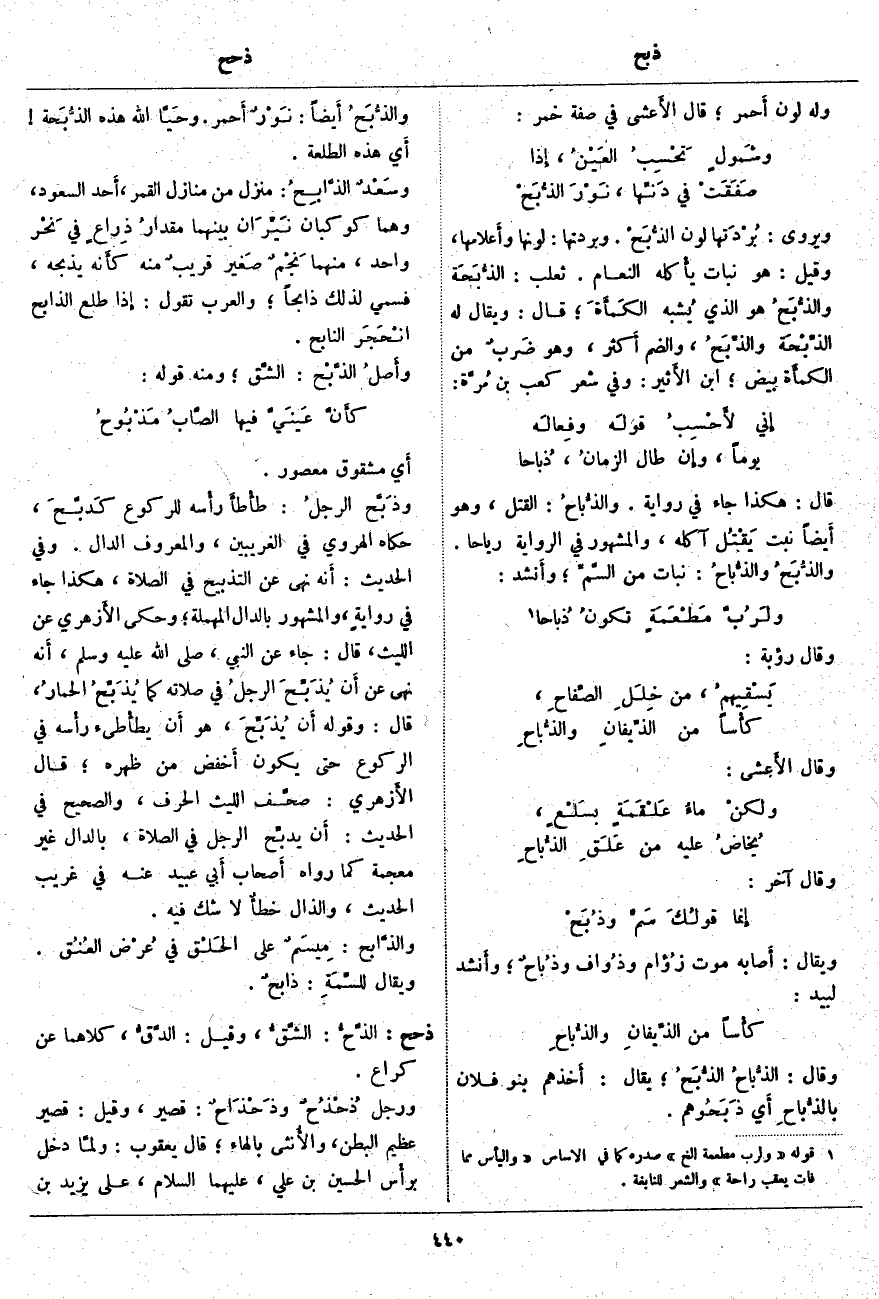قَالَ: هَكَذَا جَاءَ فِي رِوَايَةٍ. والذُّباحُ: الْقَتْلُ، وَهُوَ أَيضاً نَبْتٌ يَقْتُل آكِلَهُ، وَالْمَشْهُورُ فِي الرِّوَايَةِ رِيَاحًا. والذُّبَحُ والذُّباحُ: نَبَاتٌ مِنَ السَّمِّ؛ وأَنشد: