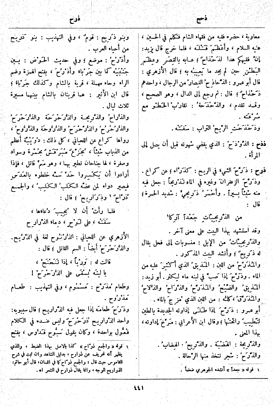، بِفَتْحِ الْهَمْزَةِ وَضَمِّ الرَّاءِ وَحَاءٍ مُهْمَلَةٍ، قَرْيَةٌ بِالشَّامِ وَكَذَلِكَ جَرْباءُ؛ قَالَ ابْنُ الأَثير: هُمَا قَرْيَتَانِ بِالشَّامِ بَيْنَهُمَا مَسِيرَةُ ثَلَاثِ لَيَالٍ. والذُّراحُ والذَّرِيحة والذُّرَحْرَحَة والذُّرَحْرَحُ والذُّرُحْرُحُ والذُّرَّحْرَحُ والذُّرُّوحَة والذُّرُّوحُ، رَوَاهَا كُرَاعٌ عَنِ اللِّحْيَانِيِّ، كُلُّ ذَلِكَ: دُوَيْبَّة أَعظم مِنَ الذُّبَابِ شَيْئًا، مُجَزَّعٌ مُبَرْقَشٌ بحُمْرة وَسَوَادٍ وَصُفْرَةٍ، لَهَا جَنَاحَانِ تَطِيرُ بِهِمَا، وَهُوَ سَمٌّ قَاتِلٌ، فإِذا أَرادوا أَن يَكْسِروا حَدَّ سَمِّه خَلَطُوهُ بالعَدَسِ فَيَصِيرُ دَوَاءً لِمَنْ عضَّه الكَلبُ الكَلِبُ: وَالْجَمْعُ ذُرَّاحٌ «2» وذَرَارِيحُ؛ قَالَ:
