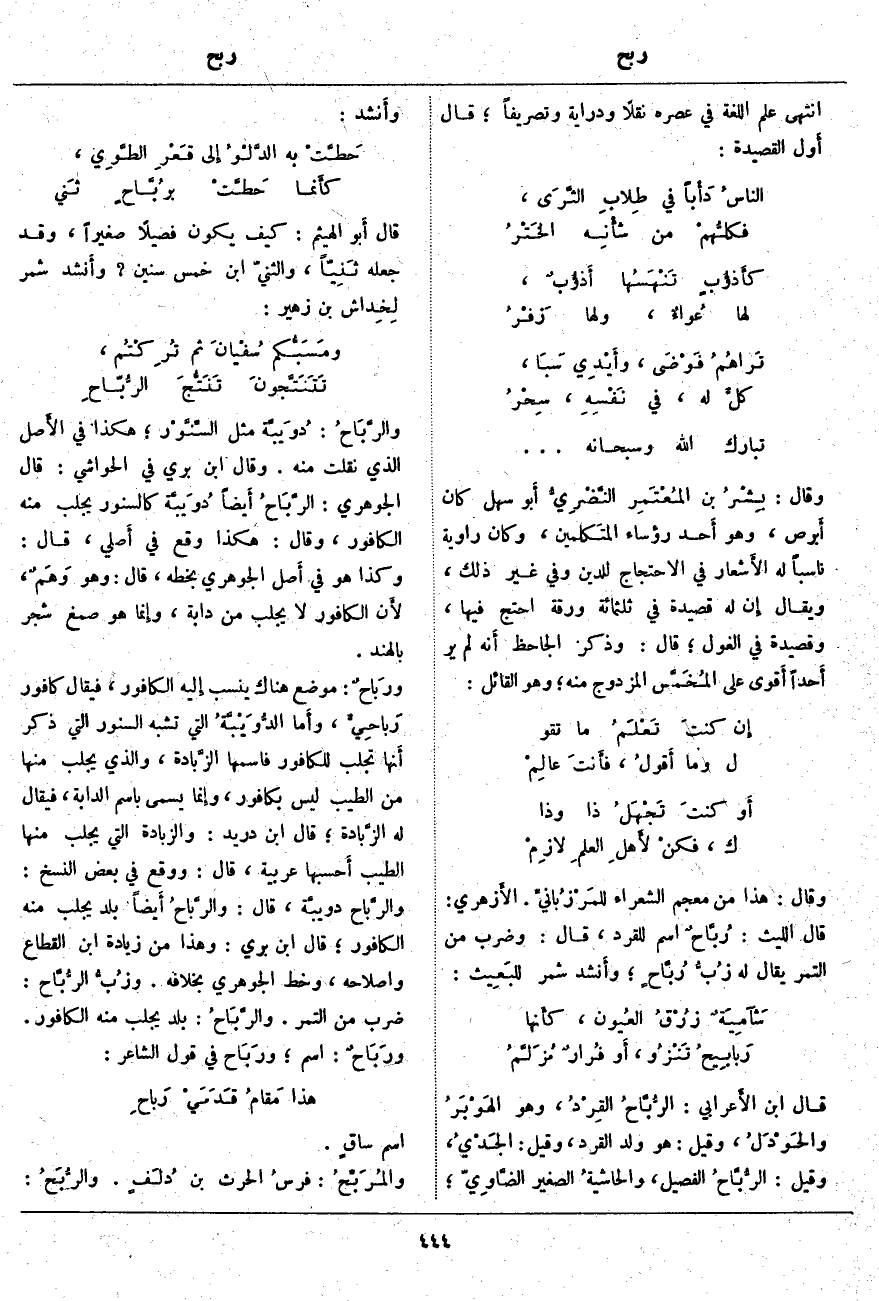 وَقَالَ: هَذَا مِنْ مُعْجَمِ الشُّعَرَاءِ للمَرْزُبانيِّ. الأَزهري: قَالَ اللَّيْثُ: رُبَّاحٌ اسْمٌ لِلْقِرْدِ، قَالَ: وَضَرْبٌ مِنَ التَّمْرِ يُقَالُ لَهُ زُبُّ رُبَّاحٍ؛ وأَنشد شَمِرٌ للبَعِيث: