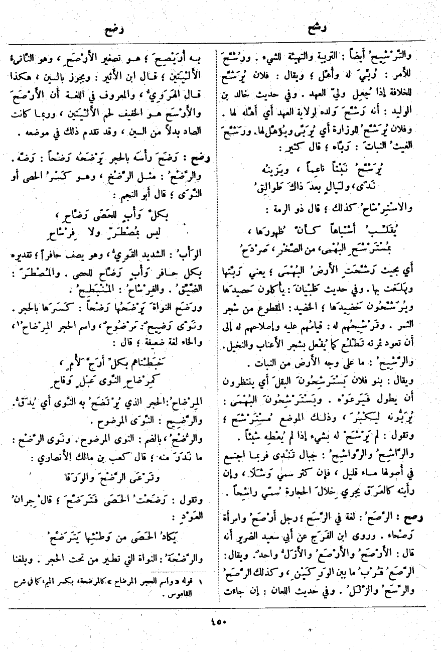 ؛ الْخَضِيدُ: الْمَقْطُوعُ مِنْ شَجَرِ الثَّمَرِ. وتَرْشِيحُهم لَهُ: قيامُهم عَلَيْهِ وإِصلاحهم لَهُ إِلى أَن تَعُودَ ثَمَرَتُهُ تَطْلُع كَمَا يُفْعل بِشَجَرِ الأَعناب وَالنَّخِيلِ. والرَّشِيحُ: مَا عَلَى وَجْهَ الأَرض مِنَ النَّبَاتِ. وَيُقَالُ: بَنُو فُلَانٍ يَسْتَرْشِحُونَ البقلَ أَي يَنْتَظِرُونَ أَن يَطُولَ فَيَرعَوْه. ويَسْتَرْشِحُونَ البُهْمَى: يُرَبُّونه ليَكْبُرَ، وَذَلِكَ الْمَوْضِعُ مُسْتَرْشَح؛ وَتَقُولَ: لَمْ يَرْشَحْ لَهُ بِشَيْءٍ إِذا لَمْ يُعْطِه شَيْئًا. والرَّاشِحُ والرَّواشِحُ: جِبَالٌ تَنْدى فَرُبَّمَا اجْتَمَعَ فِي أُصولها مَاءٌ قَلِيلٌ، فإِن كَثُرَ سُمِّي وَشَلًا، وإِن رأَيته كالعَرَق يَجْرِي خِلالَ الحجارة سُمّي راشِحاً.