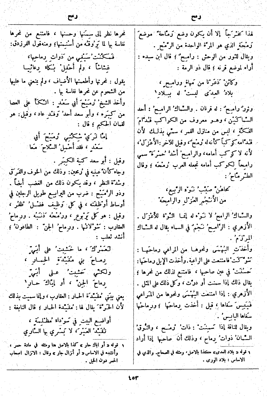 وثورٌ رامِحٌ: لَهُ قَرْنَانِ. والسِّماكُ الرامِحُ: أَحد السِّماكَيْن، وَهُوَ مَعْرُوفٌ مِنَ الْكَوَاكِبِ قُدَّامَ الفَكَّةِ، لَيْسَ مِنْ مَنَازِلِ الْقَمَرِ، سمِّي بِذَلِكَ لأَن قُدَّامه كَوْكَبًا كأَنه لَهُ رُمْحٌ، وَقِيلَ لِلْآخَرِ: الأَعْزَلُ، لأَنه لَا كَوْكَبَ أَمامه، والرامِحُ أَشدُّ حُمْرَةً سُمِّيَ رامِحاً لِكوكب أَمامه تَجْعَلُهُ الْعَرَبُ رُمْحَه؛ وَقَالَ الطِّرِمَّاحُ: