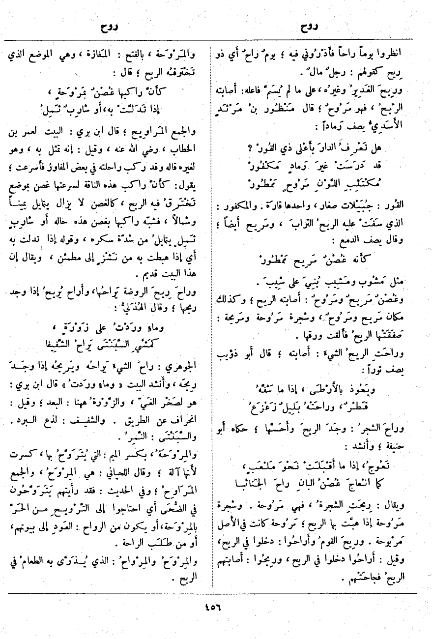 وَالْجَمْعُ المَراوِيح؛ قَالَ ابْنُ بَرِّيٍّ: الْبَيْتُ لِعُمَرَ بْنِ الْخَطَّابِ، رَضِيَ اللَّهُ عَنْهُ، وَقِيلَ: إِنه تَمَثَّلَ بِهِ، وَهُوَ لِغَيْرِهِ قَالَهُ وَقَدْ رَكِبَ رَاحِلَتَهُ فِي بَعْضِ الْمَفَاوِزِ فأَسرعت؛ يَقُولُ: كأَنَّ رَاكِبَ هَذِهِ النَّاقَةِ لِسُرْعَتِهَا غُصْنٌ بِمَوْضِعٍ تَخْتَرِقُ فِيهِ الرِّيحُ، كَالْغُصْنِ لَا يَزَالُ يَتَمَايَلُ يَمِينًا وَشِمَالًا، فَشَبَّهَ رَاكِبَهَا بِغُصْنٍ هَذِهِ حَالُهُ أَو شارِبٍ ثَمِلٍ يتمايلُ مِنْ شِدَّةِ سُكْرِهِ، وَقَوْلُهُ إِذا تَدَلَّتْ بِهِ أَي إِذا هَبَطَتْ بِهِ مِنْ نَشْزٍ إِلى مُطَمْئِنٍ، وَيُقَالُ إِن هَذَا الْبَيْتَ قَدِيمٌ. وراحَ رِيحَ الرَّوْضَةَ يَراحُها، وأَراح يُريحُ إِذا وَجَدَ رِيحَهَا؛ وَقَالَ الهُذَليُّ: