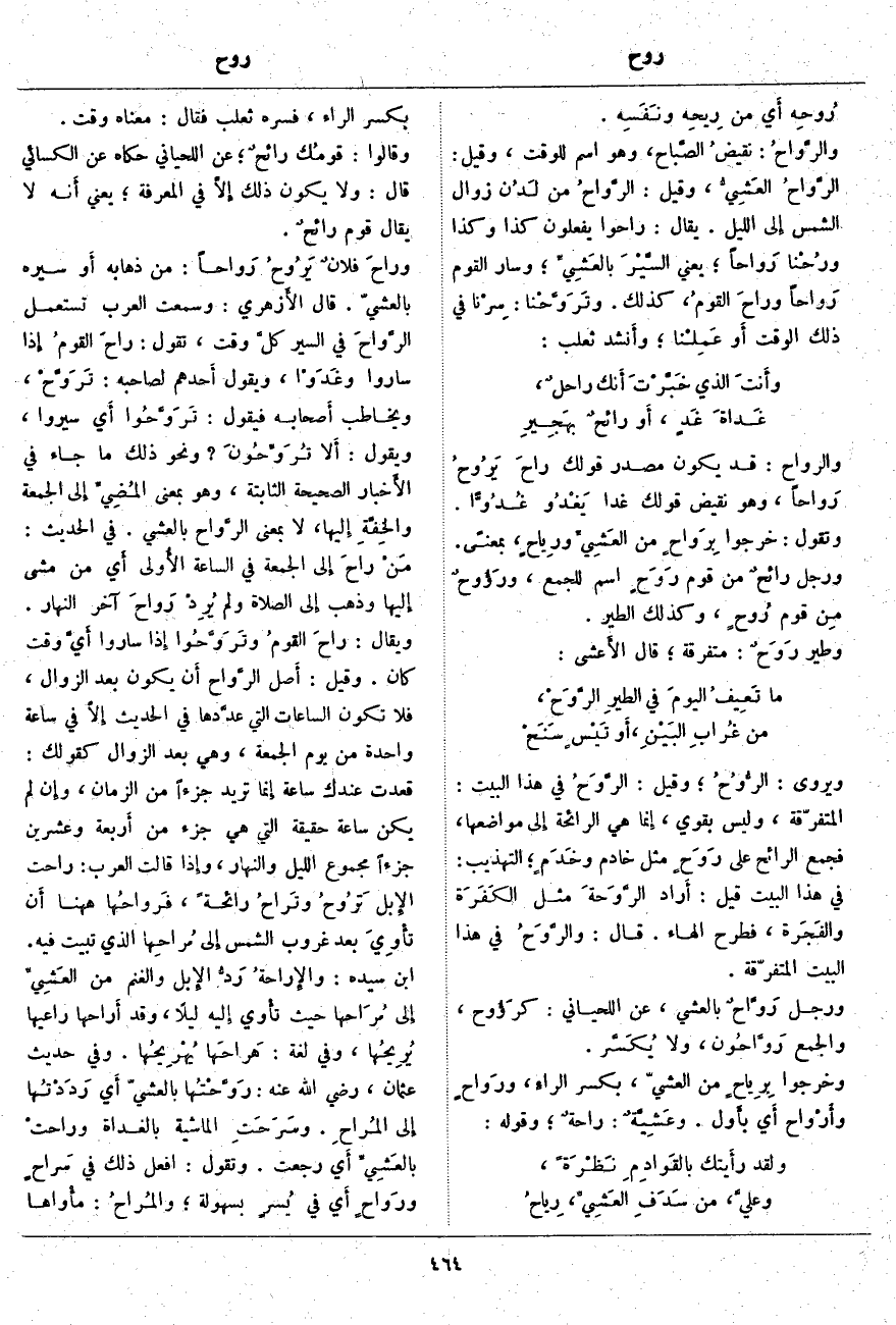 وَالرَّوَاحُ: قَدْ يَكُونُ مَصْدَرَ قَوْلِكَ راحَ يَرُوحُ رَواحاً، وَهُوَ نَقِيضُ قَوْلِكَ غَدَا يَغْدُو غُدُوًّا. وَتَقُولُ: خَرَجُوا بِرَواحٍ مِنَ العَشِيِّ ورِياحٍ، بِمَعْنًى. وَرَجُلٌ رائحٌ مِنْ قَوْمٍ رَوَحٍ اسْمٌ للجمع، ورَؤُوحٌ مِن قَوْمٍ رُوحٍ، وَكَذَلِكَ الطَّيْرُ. وَطَيْرٌ رَوَحٌ: مُتَفَرِّقَةٌ؛ قَالَ الأَعشى: