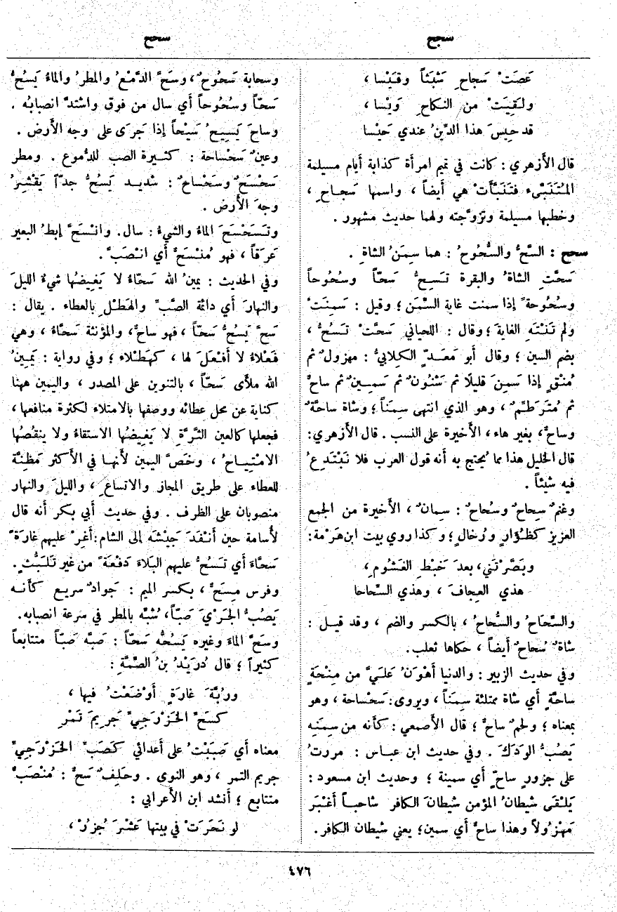 قَالَ الأَزهري: كَانَتْ فِي تَمِيمٍ امرأَة كَذَّابَةٌ أَيام مُسَيْلِمَةَ المُتَنَبِّئ فتَنَبَّأَتْ هِيَ أَيضاً، وَاسْمُهَا سَجاحِ، وَخَطَبَهَا مُسَيْلِمَةُ وتزوَّجته ولهما حديث مشهور.