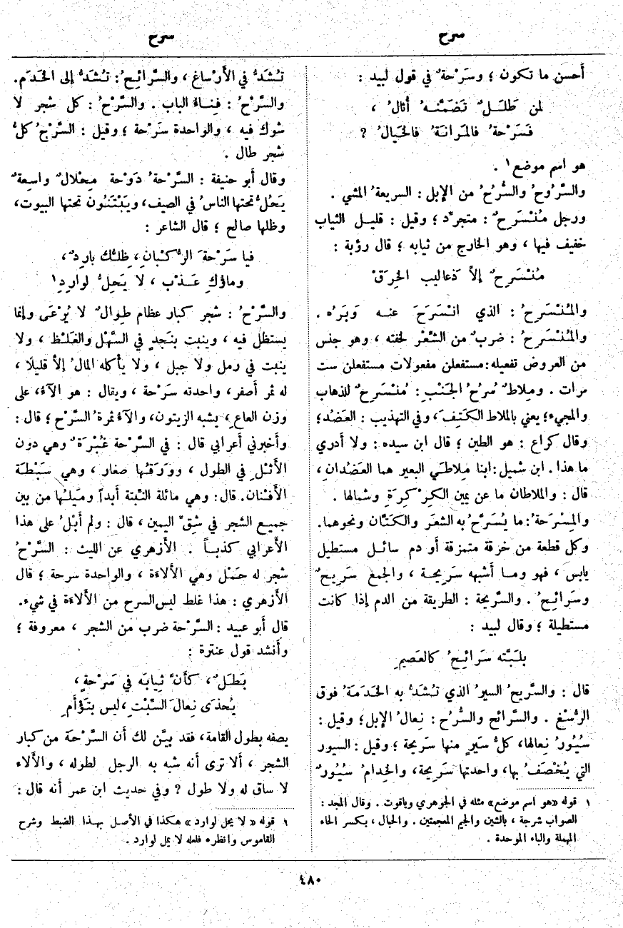 قَالَ: والسَّريحُ السيرُ الَّذِي تُشَدُّ بِهِ الخَدَمَةُ فَوْقَ الرُّسْغ. والسَّرائح والسُّرُح: نِعالُ الإِبل؛ وَقِيلَ: سُيُورُ نِعالها، كلُّ سَيرٍ مِنْهَا سَريحة؛ وَقِيلَ: السُّيُورُ الَّتِي يُخْصَفُ بِهَا، وَاحِدَتُهَا سَرِيحة، والخِدامُ سُيُورٌ تُشَدُّ فِي الأَرْساغ، والسَّرائِحُ: تُشَدُّ إِلى الخَدَم. والسَّرْحُ: فِناءُ الْبَابِ. والسَّرْحُ: كُلُّ شَجَرٍ لَا شَوْكَ فِيهِ، وَالْوَاحِدَةُ سَرْحة؛ وَقِيلَ: السَّرْحُ كلُّ شَجَرٍ طَالَ. وَقَالَ أَبو حَنِيفَةَ: السَّرْحةُ دَوْحة مِحْلالٌ واسِعةٌ يَحُلُّ تَحْتَهَا الناسُ فِي الصَّيْفِ، ويَبْتَنُون تَحْتَهَا الْبُيُوتَ، وَظِلُّهَا صَالِحٌ؛ قَالَ الشَّاعِرُ: