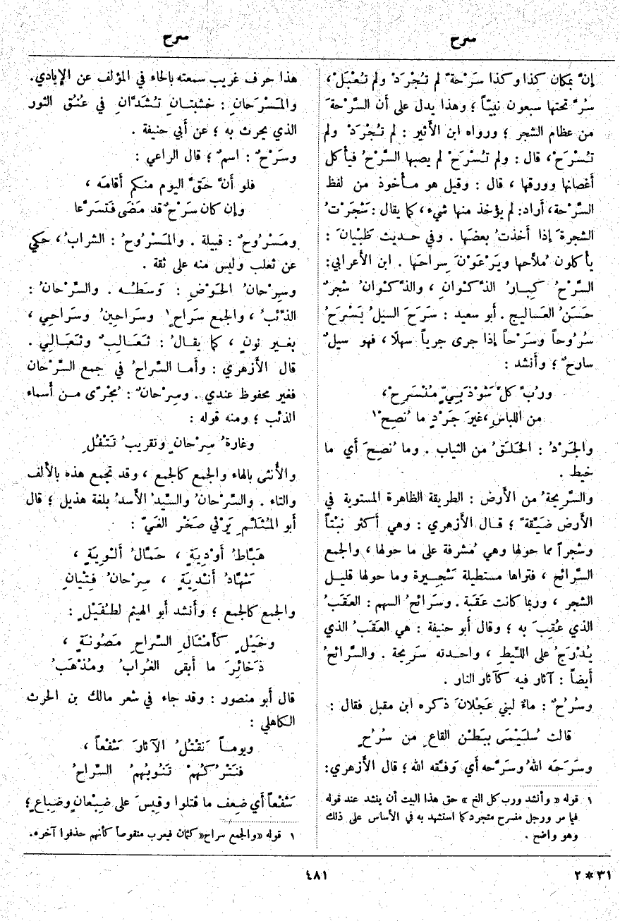 ومَسْرُوحٌ: قَبِيلَةٌ. والمَسْرُوحُ: الشرابُ، حُكِيَ عَنْ ثَعْلَبٍ وَلَيْسَ مِنْهُ على ثقة. وسِرْحانُ الحَوْضِ: وَسَطُه. والسِّرْحانُ: الذِّئبُ، والجمع سَراحٍ «2» وسَراحِينُ وسَراحِي، بِغَيْرِ نونٍ، كَمَا يقالُ: ثَعَالِبٌ وثَعَالِي. قَالَ الأَزهري: وأَما السِّراحُ فِي جَمْعِ السِّرْحان فَغَيْرُ مَحْفُوظٍ عِنْدِي. وسِرْحانٌ: مُجْرًى مِنْ أَسماء الذِّئْبِ؛ وَمِنْهُ قَوْلُهُ: