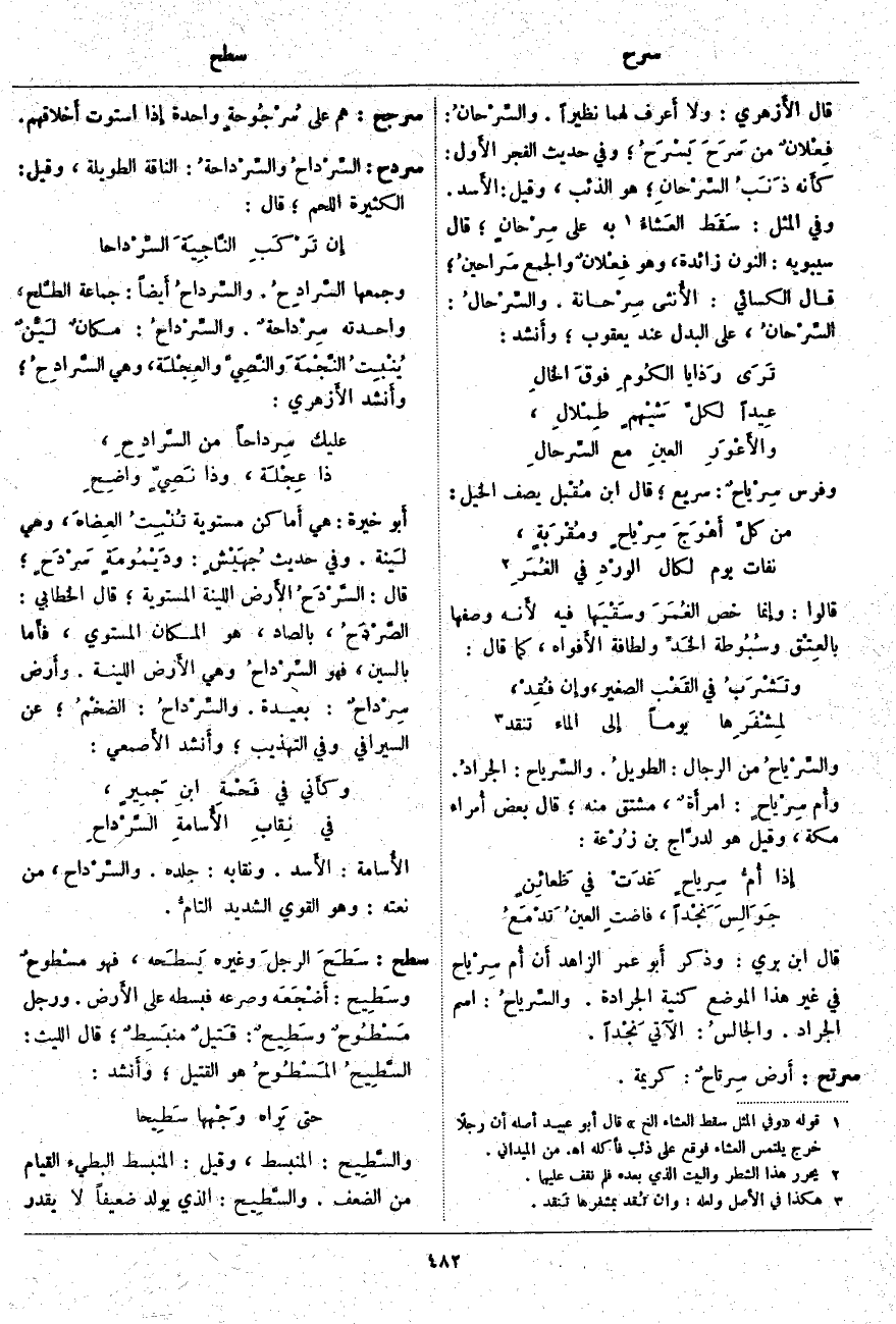 ؛ قَالَ: السَّرْدَحُ الأَرض اللَّيِّنَةُ الْمُسْتَوِيَةُ؛ قَالَ الْخَطَّابِيُّ: الصَّرْدَحُ، بِالصَّادِّ، هُوَ الْمَكَانُ الْمُسْتَوِي، فأَما بِالسِّينِ، فَهُوَ السِّرْداحُ وَهِيَ الأَرض اللَّيِّنَةُ. وأَرض سِرْداحٌ: بَعِيدَةٌ. والسِّرْداحُ: الضخْمُ؛ عَنِ السِّيرَافِيِّ وَفِي التَّهْذِيبِ؛ وأَنشد الأَصمعي: