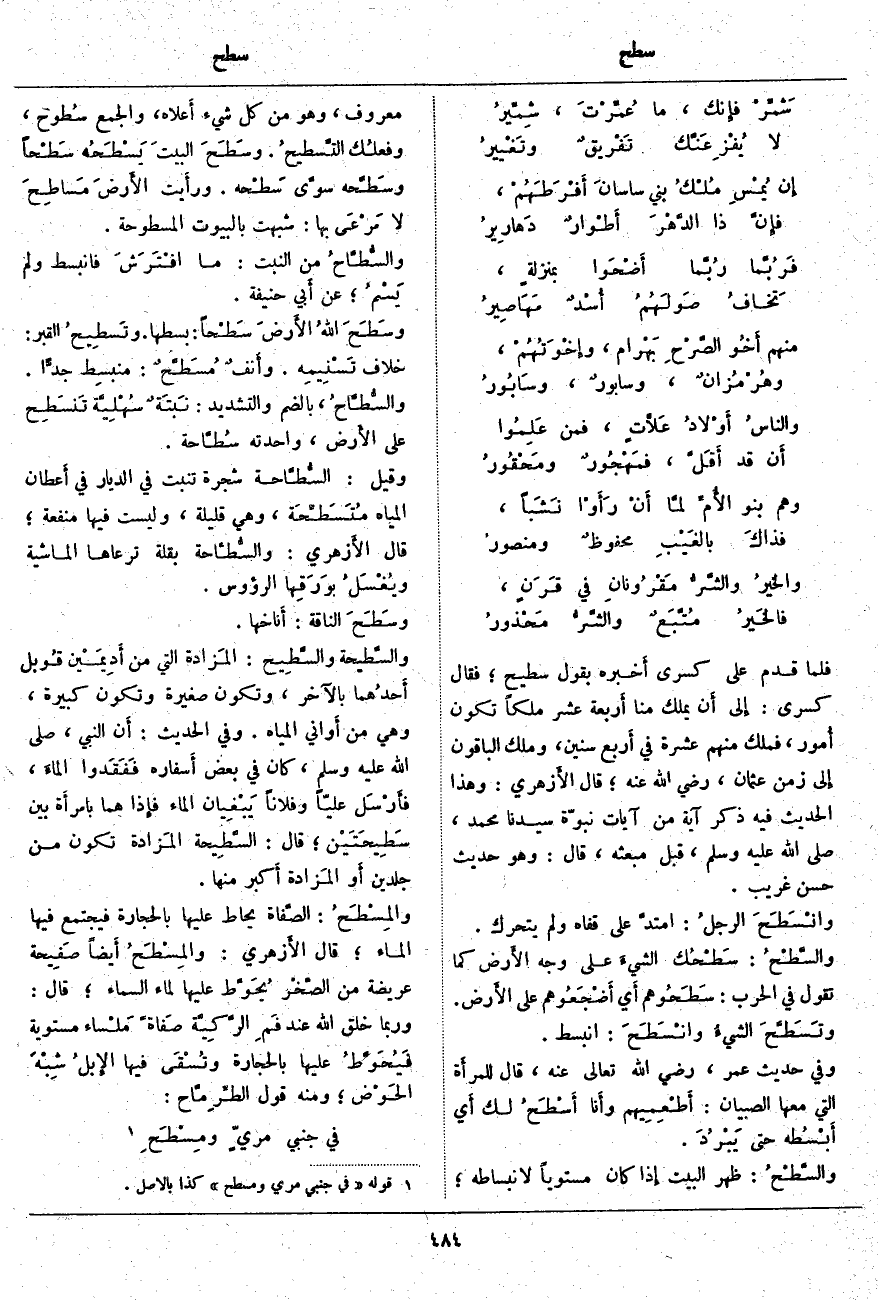 ؛ قَالَ الأَزهري: وَهَذَا الْحَدِيثُ فِيهِ ذِكْرُ آيَةٍ مِنْ آيَاتِ نُبُوَّةِ سَيِّدِنَا مُحَمَّدٍ، صَلَّى اللَّهُ عَلَيْهِ وَسَلَّمَ، قَبْلَ مَبْعَثِهِ، قَالَ: وَهُوَ حَدِيثٌ حَسَنٌ غَرِيبٌ. وانْسَطَحَ الرجلُ: امتدَّ عَلَى قَفَاهُ وَلَمْ يَتَحَرَّكِ. والسَّطْحُ: سَطْحُك الشيءَ عَلَى وَجْهِ الأَرض كَمَا تَقُولُ فِي الْحَرْبِ: سَطَحُوهم أَي أَضْجَعُوهم عَلَى الأَرض. وتَسَطَّحَ الشيءُ وانْسَطَحَ: انْبَسَطَ. وَفِي حَدِيثِ