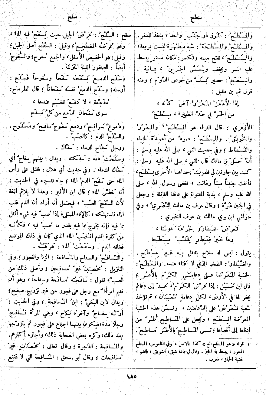 سفح: السَّفْحُ: عُرْضُ الْجَبَلِ حَيْثُ يَسْفَحُ فِيهِ الماءُ، وَهُوَ عُرْضُه المضطجِعُ؛ وَقِيلَ: السَّفْح أَصل الْجَبَلِ؛ وَقِيلَ: هُوَ الْحَضِيضُ الأَسفل، وَالْجَمْعُ سُفوح؛ والسُّفوحُ أَيضاً: الصُّخُورُ اللَّيِّنَةُ الْمُتَزَلِّقَةُ. وسَفَح الدمعَ يَسْفَحُه سَفْحاً وسُفوحاً فَسَفَح: أَرسله؛ وسَفَح الدمعُ نفسُه سَفَحاناً؛ قَالَ الطِّرِمَّاحُ: