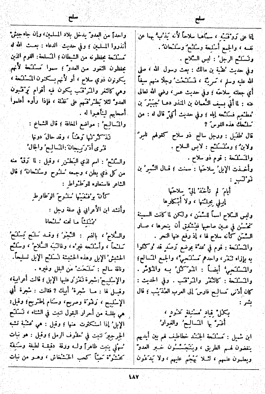 قال طُفَيل: وَرَجُلٌ سَالِحٌ ذُو سِلَاحٍ كَقَوْلِهِمْ تامِرٌ ولابنٌ؛ ومُتَسَلِّح: لَابِسٌ السِّلَاحَ. والمَسْلَحة: قَوْمٌ ذُو سِلَاحٍ. وأَخذت الإِبلُ سِلاحَها: سَمِنَتْ؛ قَالَ النَّمِرُ بْنُ تَوْلَبٍ: