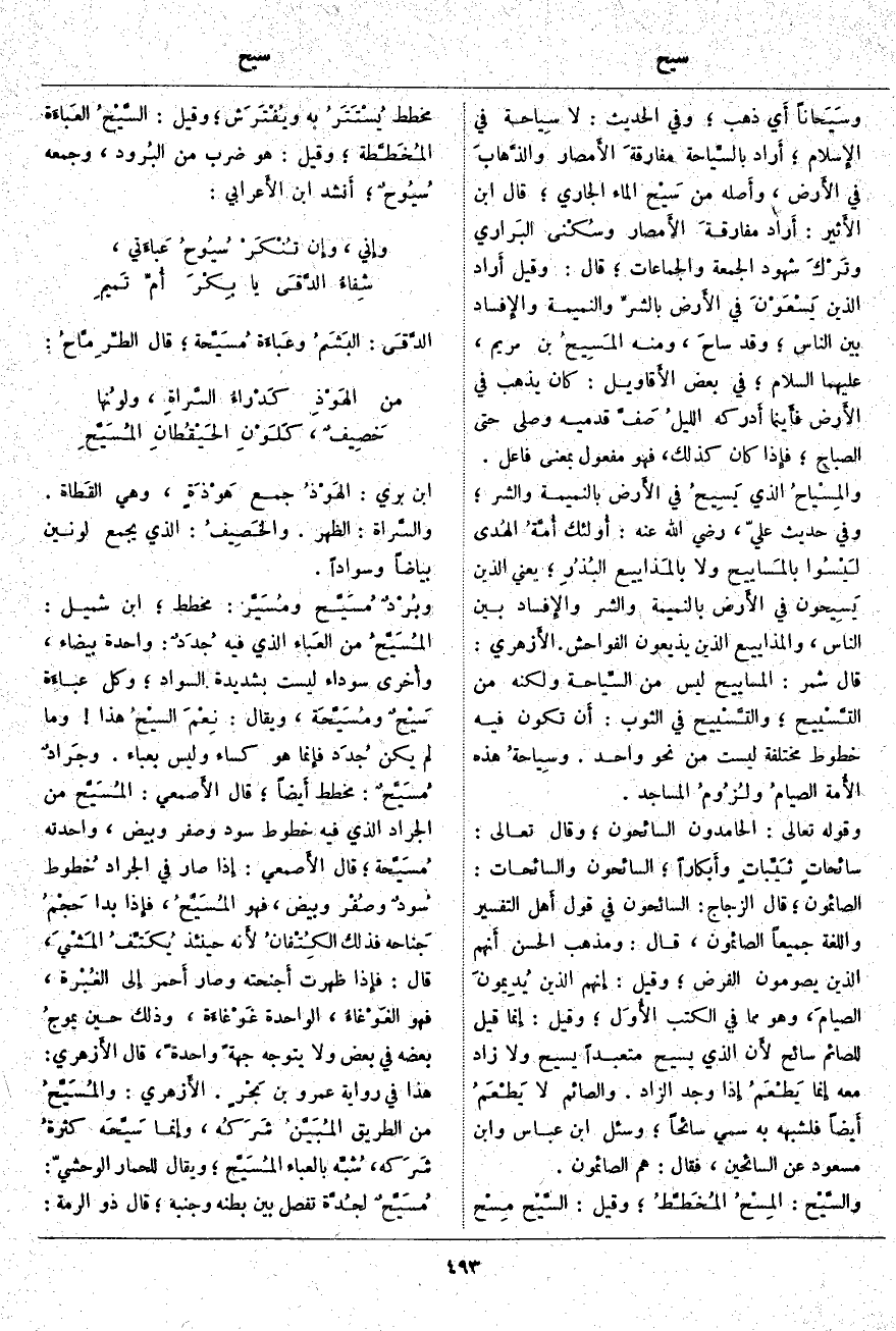 ؛ يَعْنِي الَّذِينَ يَسِيحون فِي الأَرض بِالنَّمِيمَةِ وَالشَّرِّ والإِفساد بَيْنَ النَّاسِ، وَالْمَذَايِيعُ الَّذِينَ يُذِيعُونَ الْفَوَاحِشَ. الأَزهري: قَالَ شَمِرٌ: الْمَسَايِيحُ لَيْسَ مِنَ السِّياحة وَلَكِنَّهُ مِنَ التَّسْييح؛ والتَّسْييح فِي الثَّوْبِ: أَن تَكُونَ فِيهِ خُطُوطٌ مُخْتَلِفَةٌ لَيْسَتْ مِنْ نَحْوٍ وَاحِدٍ. وسِياحةُ هَذِهِ الأُمة الصيامُ ولُزُومُ الْمَسَاجِدِ. وَقَوْلُهُ تَعَالَى: الْحامِدُونَ السَّائِحُونَ
