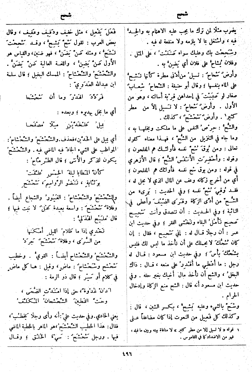 يُضْرَبُ مَثَلًا لِمَنْ تَرَكَ مَا يَجِبُ عَلَيْهِ الِاهْتِمَامُ بِهِ والجِدُّ فِيهِ، وَاشْتَغَلَ بِمَا لَا يَلْزَمُهُ وَلَا مَنْفَعَةَ لَهُ فِيهِ. وشَحِحْت بِكَ وَعَلَيْكَ سَوَاءٌ ضَنَنْتُ، عَلَى الْمَثَلِ. وَفُلَانٌ يُشاحُّ على فلان أَي يَضِنُّ بِهِ. وأَرضٌ شَحاحٌ: تسيلٌ مِنْ أَدْنى مَطَرَةٍ كأَنها تَشِحُّ عَلَى الْمَاءِ بِنَفْسِهَا؛ وَقَالَ أَبو حَنِيفَةَ: الشِّحاحُ شِعابٌ صِغَارٌ لَوْ صَبَبْتَ فِي إِحداهن قِرْبة أَسالته، وَهُوَ مِنَ الأَول. وأَرضٌ شَحاحٌ: لَا تَسيل إِلّا مِنْ مَطَرٍ كَثِيرٍ «1». وأَرضٌ شَحْشَحٌ، كَذَلِكَ. والشُّحُّ: حِرْصُ النَّفْسِ عَلَى مَا مَلَكَتْ وَبُخْلُهَا بِهِ، وَمَا جَاءَ فِي التَّنْزِيلِ مِنَ الشُّحِّ، فَهَذَا مَعْنَاهُ كَقَوْلِهِ تَعَالَى: وَمَنْ يُوقَ شُحَّ نَفْسِهِ فَأُولئِكَ هُمُ الْمُفْلِحُونَ*