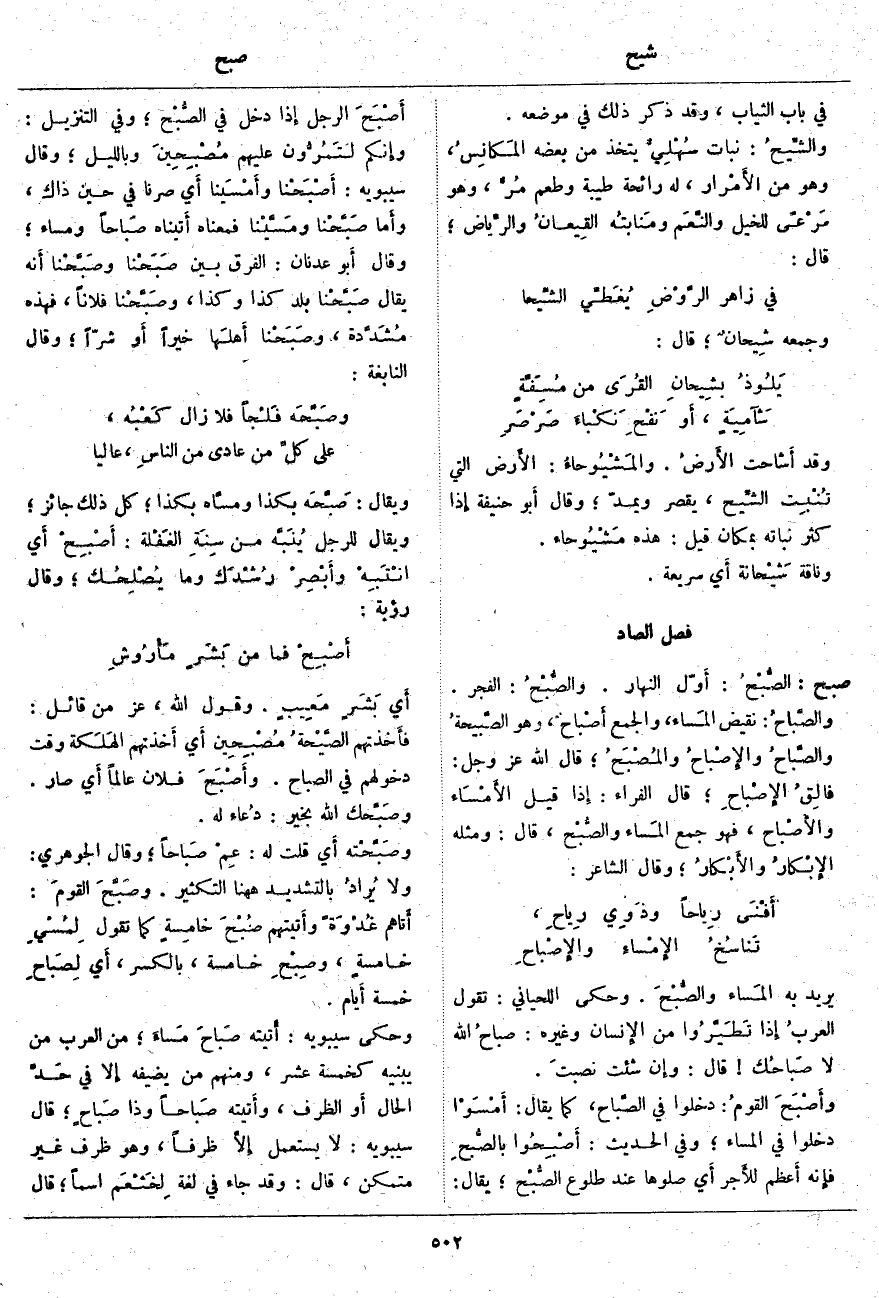 صبح: الصُّبْحُ: أَوّل النَّهَارِ. والصُّبْحُ: الفجر. والصَّباحُ: نقيص المَساء، وَالْجَمْعُ أَصْباحٌ، وَهُوَ الصَّبيحةُ والصَّباحُ والإِصْباحُ والمُصْبَحُ؛ قَالَ اللَّهُ عَزَّ وَجَلَّ: فالِقُ الْإِصْباحِ