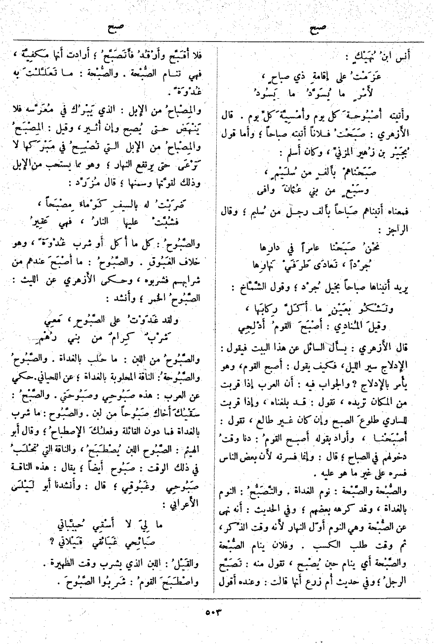 قَالَ الأَزهري: يسأَل السَّائِلُ عَنْ هَذَا الْبَيْتِ فَيَقُولُ: الإِدلاج سَيْرُ اللَّيْلِ، فَكَيْفَ يَقُولُ: أَصبح الْقَوْمُ، وَهُوَ يأْمر بالإِدلاج؟ وَالْجَوَابُ فِيهِ: أَن الْعَرَبَ إِذا قَرُبَتْ مِنَ الْمَكَانِ تُرِيدُهُ، تَقُولُ: قَدْ بَلَغْنَاهُ، وإِذا قَرَّبَتْ لِلسَّارِي طلوعَ الصُّبْحِ وإِن كَانَ غَيْرَ طَالِعٍ، تَقُولُ: أَصْبَحْنا، وأَراد بِقَوْلِهِ أَصبح القومُ: دَنَا وقتُ دُخُولِهِمْ فِي الصَّبَاحِ؛ قَالَ: وإِنما فَسَّرْتُهُ لأَن بَعْضَ النَّاسِ فَسَّرَهُ عَلَى غَيْرِ مَا هُوَ عَلَيْهِ. والصُّبْحة والصَّبْحة: نَوْمُ الْغَدَاةِ. والتَّصَبُّحُ: النَّوْمُ بِالْغَدَاةِ، وَقَدْ كَرِهَهُ بَعْضُهُمْ؛ وَفِي الْحَدِيثِ: