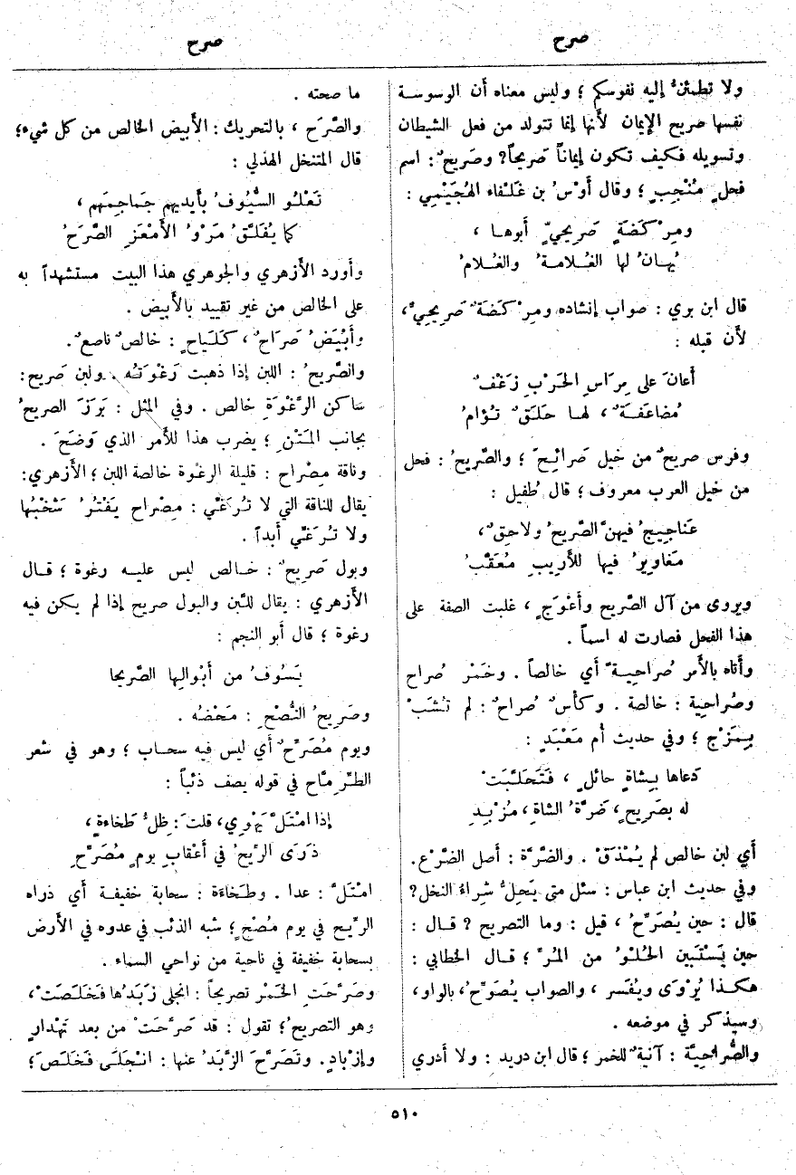 ؛ قَالَ الْخَطَّابِيُّ: هَكَذَا يُرْوَى ويُفَسر، وَالصَّوَابُ يُصَوِّحُ، بِالْوَاوِ، وَسَيُذْكَرُ فِي مَوْضِعِهِ. والصُّراحِيَّة: آنيةٌ لِلْخَمْرِ؛ قَالَ ابْنُ دُرَيْدٍ: وَلَا أَدري مَا صِحَّتُهُ. والصَّرَح، بِالتَّحْرِيكِ: الأَبيض الْخَالِصُ مِنْ كُلِّ شَيْءٍ؛ قَالَ الْمُتَنَخِّلُ الْهُذَلِيُّ: