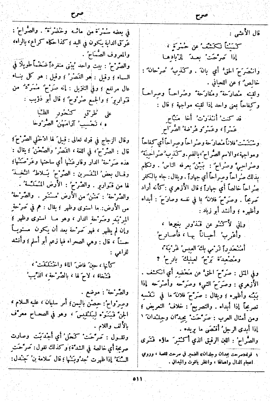 وَفِي الْمَثَلِ: صَرَّحَ الحقُّ عَنْ مَحْضِهِ أَي انْكَشَفَ. الأَزهري: وصَرَحَ الشيءَ وصَرَّحه وأَصْرَحه إِذا بَيَّنه وأَظهره؛ وَيُقَالُ: صَرَّحَ فلانٌ مَا فِي نَفْسِه تَصْرِيحًا إِذا أَبداه. والتصريحُ: خلافُ التَّعْرِيضِ؛ وَمِنْ أَمثال الْعَرَبِ: صَرَّحَتْ بِجِدَّان وجِلْدانَ «1» إِذا أَبدى الرجلُ أَقْصَى مَا يُرِيدُهُ. والصُّراحُ: اللَّبَنُ الرَّقِيقُ الَّذِي أُكْثِرَ ماؤُه فَتَرى فِي بَعْضِهِ سُمْرَة مِنْ مَائِهِ وخُضْرَةً. والصُّراحُ: عَرَق الدَّابَّةِ يَكُونُ فِي الْيَدِ؛ كَذَا حَكَاهُ كُرَاعٌ، بِالرَّاءِ، وَالْمَعْرُوفُ الصُّمَاحُ. والصَّرْحُ: بَيْتٌ وَاحِدٌ يُبْنى مُنْفَرِدًا ضَخْماً طَوِيلًا فِي السَّمَاءِ؛ وَقِيلَ: هُوَ القَصْرُ؛ وَقِيلَ: هُوَ كُلُّ بِنَاءٍ عَالٍ مرتفع؛ وفي التنزيل: نَّهُ صَرْحٌ مُمَرَّدٌ مِنْ قَوارِيرَ