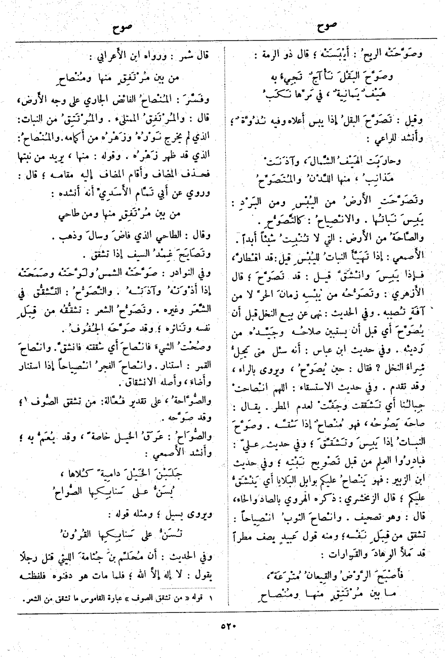 وَقَالَ: الطَّاحِي الَّذِي فاضَ وسالَ وَذَهَبَ. وتَصَايَحَ غِمْدُ السَّيْفِ إِذا تَشَقَّقَ. وَفِي النَّوَادِرِ: صَوَّحَتْه الشمسُ ولَوَّحَتْه وصَمَحَتْه إِذا أَذْوَتْهُ وآذَتْهُ. والتَّصَوُّحُ: التَّشقُّق فِي الشَّعَر وَغَيْرِهِ. وتَصَوُّحُ الشَّعَرِ: تشقُّقُه مِنْ قِبَلِ نَفْسِهِ وتَناثره؛ وَقَدْ صَوَّحَه الجُفُوفُ. وصُحْتُ الشيءَ فانْصاحَ أَي شَقَقْتُهُ فانشقَّ. وانْصاحَ الْقَمَرُ: اسْتَنَارَ. وانْصاحَ الفجرُ انْصِياحاً إِذا اسْتَنَارَ وأَضاءَ، وأَصله الِانْشِقَاقُ. والصُّوَّاحةُ، عَلَى تَقْدِيرِ فُعَّالة: مِنْ تَشَقُّقِ الصُّوف «1»؛ وَقَدْ صَوَّحه. والصُّوَاحُ: عَرَقُ الْخَيْلِ خَاصَّةً، وَقَدْ يُعَمُّ به؛ وأَنشد الأَصمعي: