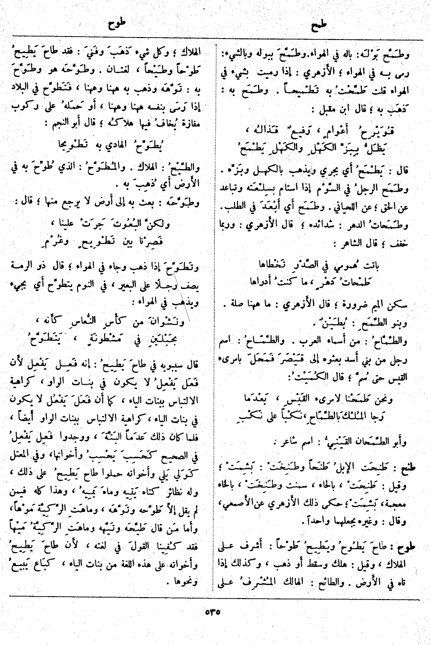 طوح: طاحَ يَطُوحُ ويَطِيحُ طَوْحاً: أَشرف عَلَى الْهَلَاكِ، وَقِيلَ: هَلَكَ وَسَقَطَ أَو ذَهَبَ، وَكَذَلِكَ إِذا تَاهَ فِي الأَرض. وَالطَّائِحُ: الْهَالِكُ المُشْرِفُ عَلَى الْهَلَاكِ؛ وَكُلُّ شَيْءٍ ذَهَبَ وفَنيَ: فَقَدْ طاحَ يَطِيحُ طَوْحاً وطَيْحاً، لُغَتَانِ. وطَوَّحَه هُوَ وطَوَّحَ بِهِ: تَوَّهَه وَذَهَبَ بِهِ هَاهُنَا وَهَاهُنَا، فَتَطوَّح فِي الْبِلَادِ إِذا رَمَى بِنَفْسِهِ هَاهُنَا وَهَاهُنَا، أَو حَمَلهُ عَلَى رُكُوبِ مَفَازَةٍ يُخافُ فِيهَا هلاكُه؛ قَالَ أَبو النَّجْمِ: