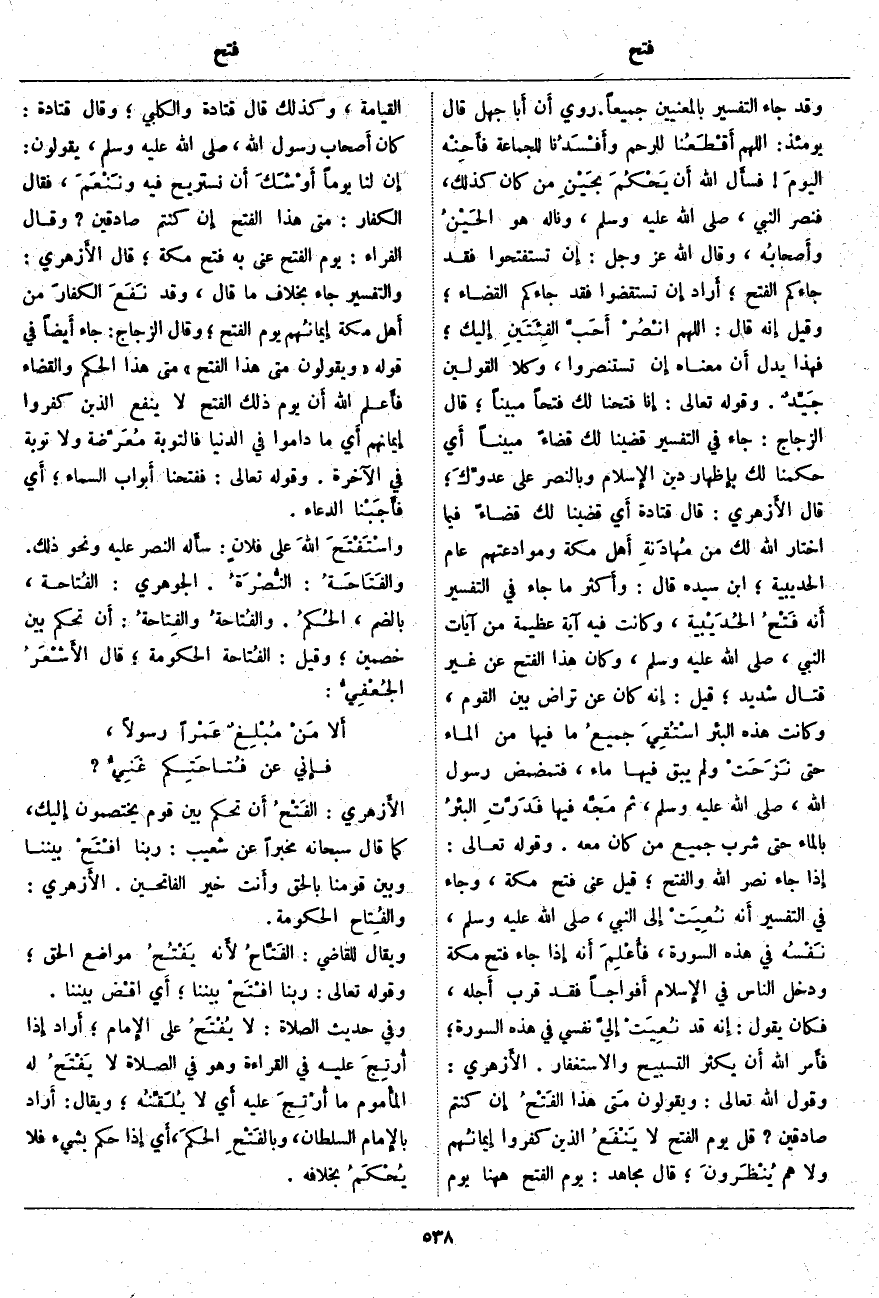 الأَزهري: وَقَوْلُ اللَّه تَعَالَى: وَيَقُولُونَ مَتى هذَا الْفَتْحُ إِنْ كُنْتُمْ صادِقِينَ قُلْ يَوْمَ الْفَتْحِ لَا يَنْفَعُ الَّذِينَ كَفَرُوا إِيمانُهُمْ وَلا هُمْ يُنْظَرُونَ