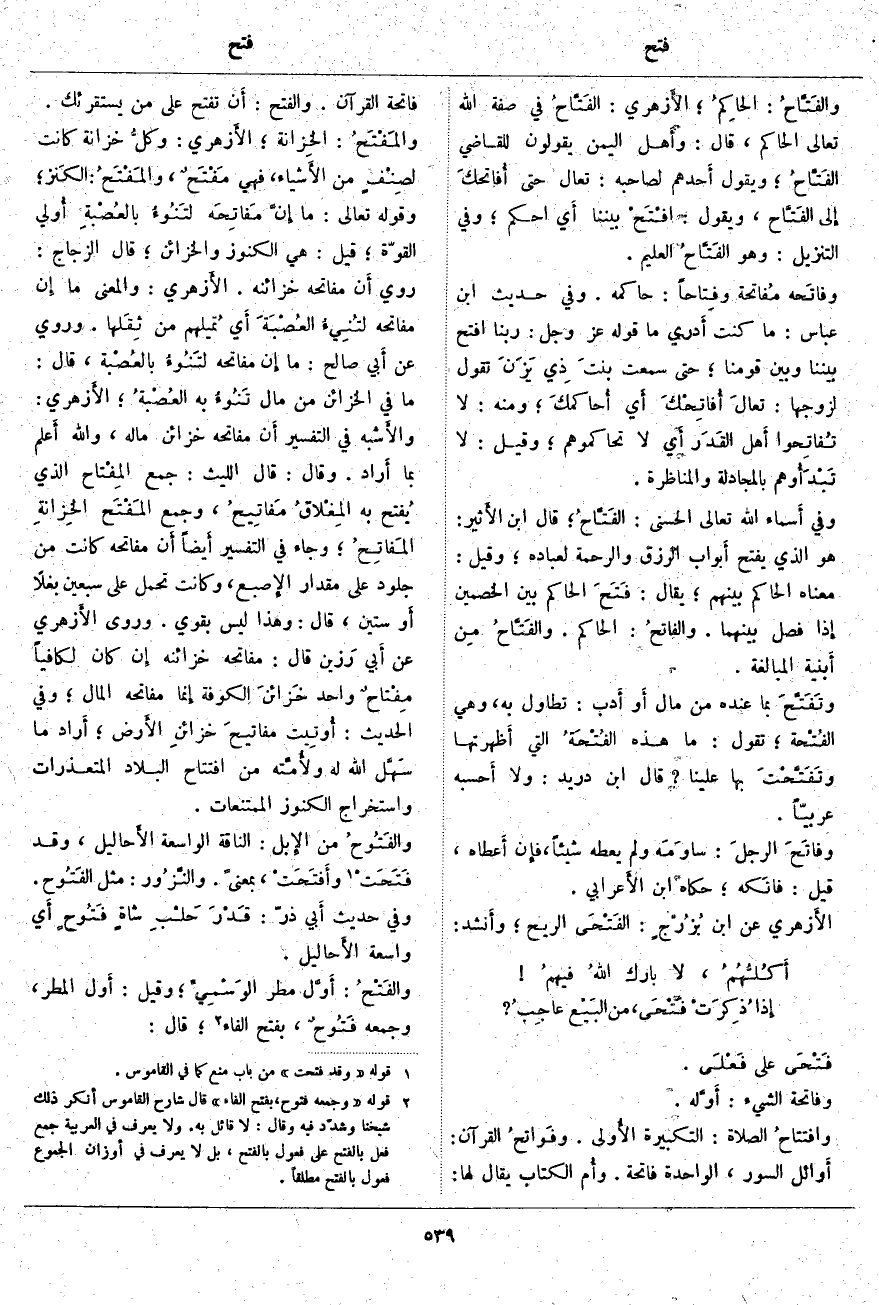 (2). 2 قوله" وَجَمْعُهُ فَتُوحٌ، بِفَتْحِ الْفَاءِ" قال شارح القاموس أنكر ذلك شيخنا وشدّد فيه وقال: لا قائل به. ولا يعرف في العربية جمع فعل بالفتح على فعول بالفتح، بل لا يعرف في أوزان الجموع فعول بالفتح مطلقا.