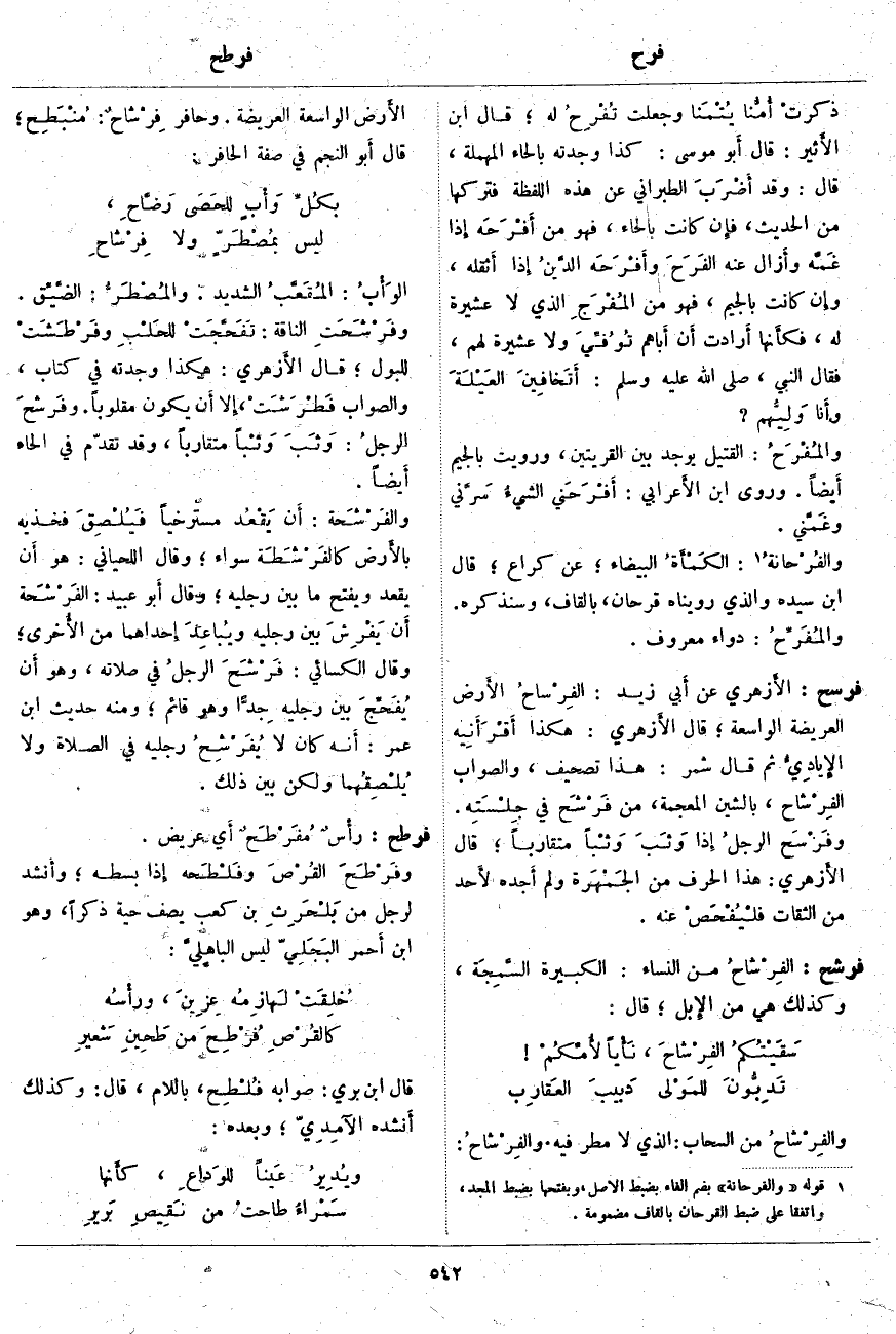 فرطح: رأْسٌ مُفَرْطَحٌ أَي عَرِيضٌ. وفَرْطَحَ القُرْصَ وفَلْطَحه إِذا بَسَطَهُ؛ وأَنشد لِرَجُلٍ مِنْ بَلْحَرِثِ بْنِ كَعْبٍ يَصِفُ حَيَّةً ذَكَرًا، وَهُوَ ابْنُ أَحمر البَجَلِيّ لَيْسَ الباهِليَّ: