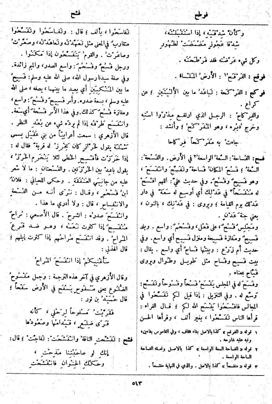 فسح: الفُساحةُ: السَّعةُ الواسعةُ «2» فِي الأَرض. والفُسْحةُ: السَّعةُ؛ فَسُحَ المكانُ فَساحةً وتَفَسَّحَ وانْفَسَحَ، وَهُوَ فَسِيحٌ وفُسُحٌ. وَفِي حَدِيثِ