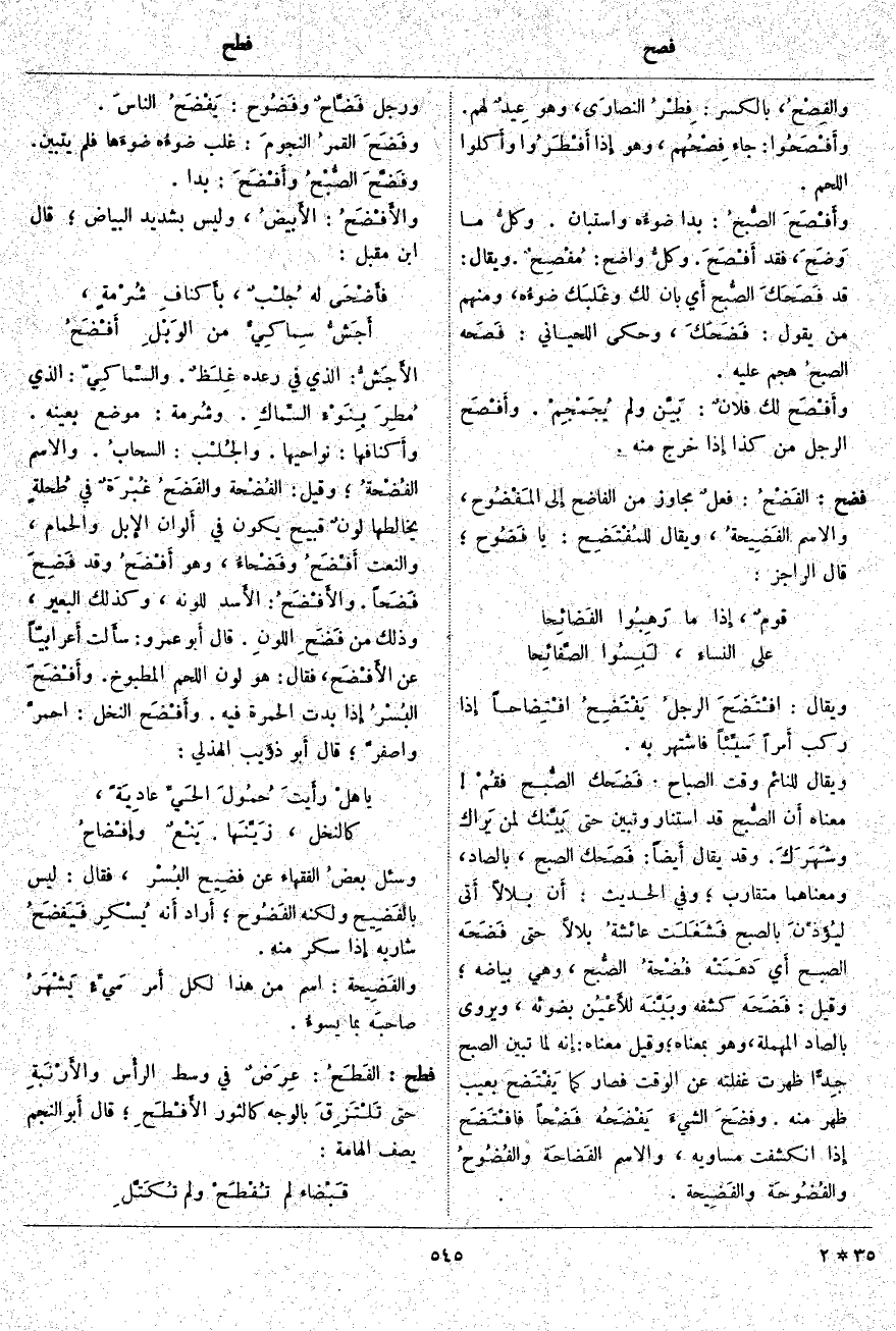 والفِصْحُ، بِالْكَسْرِ: فِطْرُ النصارَى، وَهُوَ عِيدٌ لَهُمْ. وأَفْصَحُوا: جَاءَ فِصْحُهم، وَهُوَ إِذا أَفْطَرُوا وأَكلوا اللَّحْمَ. وأَفْصَحَ الصُّبحُ: بَدَا ضوءُه وَاسْتَبَانَ. وكلُّ مَا وَضَحَ، فَقَدْ أَفْصَحَ. وكلُّ وَاضِحٍ: مُفْصِحٌ. وَيُقَالُ: قَدْ فَصَحَكَ الصُّبح أَي بَانَ لَكَ وغَلبَك ضوءُه، وَمِنْهُمْ مَنْ يَقُولُ: فَضَحَكَ، وَحَكَى اللِّحْيَانِيُّ: فَصَحه الصبحُ هَجَمَ عَلَيْهِ. وأَفْصَح لَكَ فلانٌ: بَيَّن وَلَمْ يُجَمْجِمْ. وأَفْصَح الرَّجُلُ مِنْ كَذَا إِذا خَرَجَ مِنْهُ.