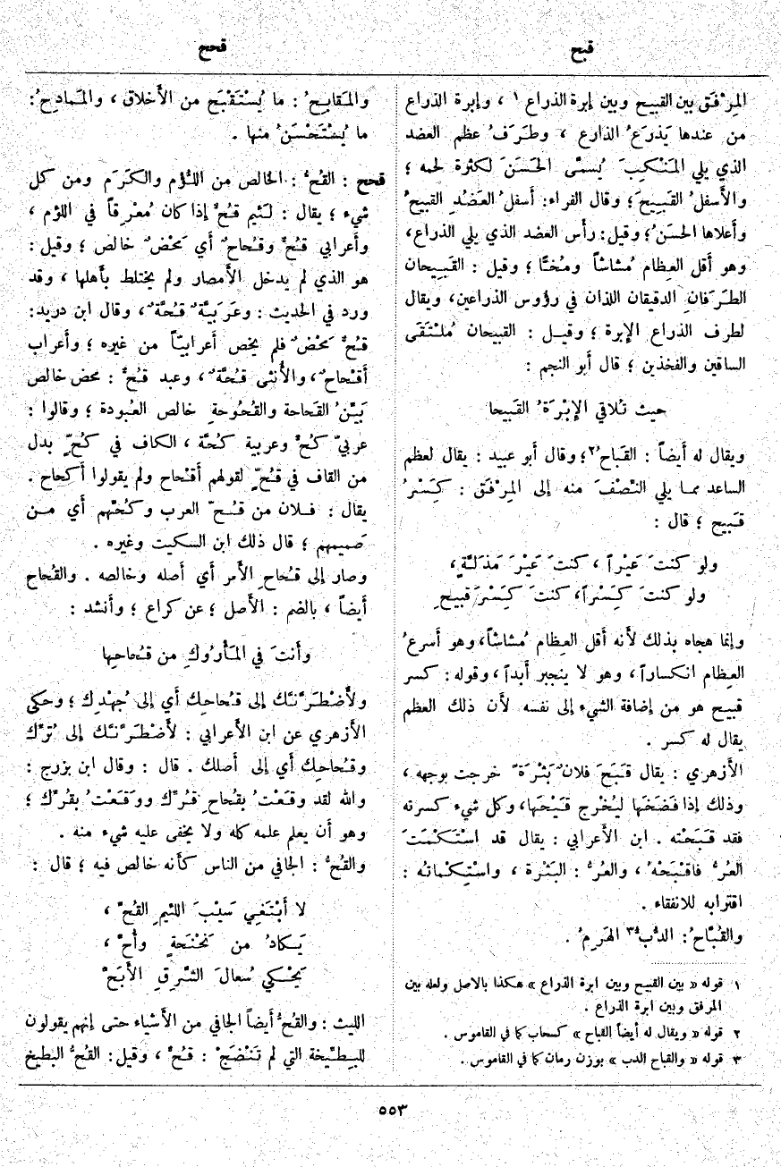 وإِنما هَجَاهُ بِذَلِكَ لأَنه أَقل العِظام مُشاشاً، وَهُوَ أَسرعُ العِظام انْكِسَارًا، وَهُوَ لَا يَنْجَبِرُ أَبداً، وَقَوْلُهُ: كَسْرَ قَبِيحٍ هُوَ مِنْ إِضافة الشَّيْءِ إِلى نَفْسِهِ لأَن ذَلِكَ الْعَظَمَ يُقَالُ لَهُ كَسْرٌ. الأَزهري: يُقَالُ قَبَحَ فلانٌ بَثْرَةً خَرَجَتْ بِوَجْهِهِ، وَذَلِكَ إِذا فَضَخَها ليُخْرج قَيْحَها، وَكُلُّ شَيْءٍ كَسَّرْتَهُ فَقَدْ قَبَحْته. ابْنُ الأَعرابي: يُقَالُ قَدِ اسْتَكْمَتَ العُرُّ فاقْبَحْهُ، والعُرُّ: البَثْرة، واسْتِكْماتُه: اقْتِرَابُهُ لِلِانْفِقَاءِ. والقُبَّاحُ: الدُّبُّ «3» الهَرِمُ. والمَقابِحُ: مَا يُسْتَقْبَح مِنَ الأَخلاق، والمَمادِحُ: مَا يُسْتَحْسَنُ منها.