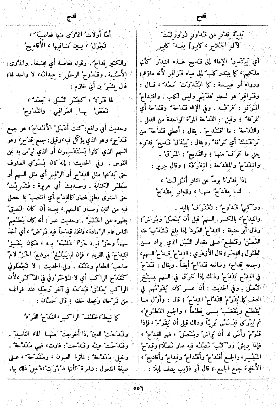 ؛ قَالَ: وأَوّل مَا يُقْطَع ويُقْضَبُ يُسَمَّى قِطْعاً، وَالْجَمْعُ القُطُوعُ، ثُمَّ يُبْرَى فيُسَمَّى بَرِيّاً وَذَلِكَ قَبْلَ أَن يُقَوَّمَ، فإِذا قُوِّمَ وأَنَى لَهُ أَن يُراشَ ويُنْصَلَ، فَهُوَ القِدْحُ، فإِذا رِيشَ ورُكِّبَ نَصْلُه فِيهِ صَارَ نَصْلًا؛ وقِدْحُ المَيْسِر، وَالْجَمْعُ أَقْدُحٌ وقِداحٌ وأَقاديحُ، الأَخيرة جَمْعُ الْجَمْعِ؛ قَالَ أَبو ذُؤَيْبٍ يَصِفُ إِبلًا: