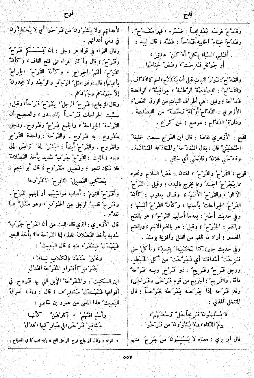 قرح: القَرْحُ والقُرْحُ، لُغَتَانِ: عَضُّ السِّلَاحِ وَنَحْوُهُ مِمَّا يَجْرَحُ الجسدَ وَمِمَّا يَخْرُجُ بِالْبَدَنِ؛ وَقِيلَ: القَرْحُ الآثارُ، والقُرْحُ الأَلَمُ؛ وَقَالَ يَعْقُوبُ: كأَنَّ القَرْحَ الجِراحاتُ بأَعيانها، وكأَنَّ القُرْحَ أَلَمُها؛ وَفِي حَدِيثِ أُحُدٍ: