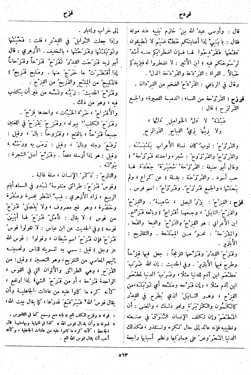 أَي تَوْبَلَه، مِنَ القِزْح، وَهُوَ التابَلُ الَّذِي يُطرح فِي القِدْر كالكَمُّون والكُزْبَرَةِ وَنَحْوَ ذَلِكَ، وَالْمَعْنَى: أَن المَطْعَمَ وإِن تَكَلَّفَ الإِنسان التَّنَوُّقَ فِي صَنْعَتِهِ وَتَطْيِيبِهِ فإِنه عَائِدٌ إِلى حَالٍ تُكره وَتُسْتَقْذَرُ، فَكَذَلِكَ الدُّنْيَا المَحْرُوصُ عَلَى عِمارَتِها وَنَظْمِ أَسبابها رَاجِعَةٌ إِلى خَرَابٍ وإِدبار. وإِذا جَعَلْتَ التَّوابلَ فِي القِدْرِ، قُلْتَ: فَحَّيْتُها وتَوْبَلْتُها وقَزَحْتُها، بِالتَّخْفِيفِ. الأَزهري: قَالَ أَبو زَيْدٍ قَزَحَت القِدْرُ تَقْزَحُ قَزْحاً وقَزَحاناً إِذا أَقْطَرَتْ مَا خَرَجَ مِنْهَا، ومَليح قَزيحٌ؛ فالمَلِيحُ مِنَ المِلْحِ والقَزيحُ مِنَ القِزْح. وقَزَّحَ الحديثَ: زَيَّنه وتَمَّمه مِنْ غَيْرِ أَن يَكْذِبَ فِيهِ، وَهُوَ مِنْ ذَلِكَ. والأَقْزاحُ، خُرْءُ الحَيَّات، وَاحِدُهَا قِزْحٌ. وقَزَحَ الكلبُ «1» بِبَوْلِهِ، وقَزِحَ يَقْزَحُ فِي اللُّغَتَيْنِ جَمِيعًا قَزْحاً، بِالْفَتْحِ، وقُزوحاً: بالَ، وَقِيلَ: رَفَعَ رِجْلَهُ وبالَ، وَقِيلَ: رَمَى بِهِ ورَشَّه، وَقِيلَ: هُوَ إِذا أَرسله دُفَعًا. وقَزَّحَ أَصلَ الشَّجَرَةِ: بَوَّلَه. والقازحُ: ذَكَرُ الإِنسان، صِفَةٌ غَالِبَةٌ. وقوسُ قُزَحَ: طَرَائِقُ متقوسةٌ تَبْدو فِي السماءِ أَيام الرَّبِيعِ، زَادَ الأَزهري: غِبَّ المَطر بِحُمْرَةٍ وصُفْرة وخُضْرة، وَهُوَ غَيْرُ مَصْرُوفٍ، وَلَا يُفْصَلُ قُزَحُ مِنْ قَوْسٍ؛ لَا يُقَالُ: تأَمَّلْ قُزَحَ فَمَا أَبْيَنَ قَوْسَهُ؛ وَفِي الْحَدِيثِ