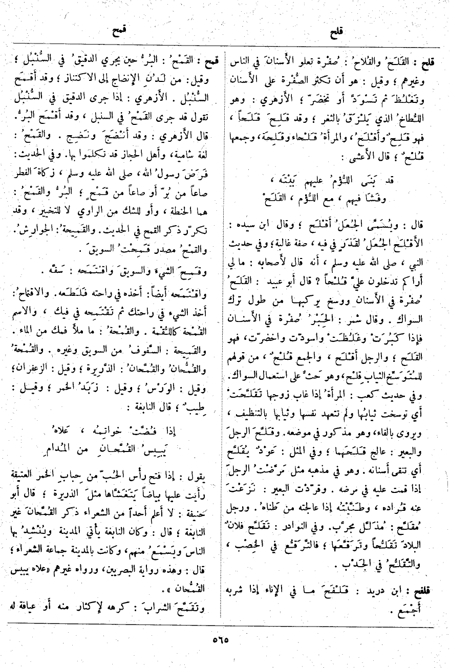 ؛ البُرُّ والقَمْحُ: هُمَا الْحِنْطَةُ، وأَو لِلشَّكِّ مِنَ الرَّاوِي لَا لِلتَّخْيِيرِ، وَقَدْ تكرَّر ذِكْرُ الْقَمْحِ فِي الْحَدِيثِ. والقَمِيحةُ: الجوارِشُ. والقمْحُ مَصْدَرُ قَمِحْتُ السويقَ. وقَمِحَ الشيءَ والسويقَ واقْتَمَحه: سَفَّه. واقْتَمَحه أَيضاً: أَحذه فِي رَاحَتِهِ فَلَطَعه. والاقتماحُ: أَخذ الشَّيْءِ فِي رَاحَتِكَ ثُمَّ تَقْتَمِحه فِي فِيكَ، وَالِاسْمُ القُمْحة كاللُّقْمة. والقُمْحةُ: مَا ملأَ فَمَكَ مِنَ الْمَاءِ. والقَمِيحة: السَّفوفُ مِنَ السَّوِيقِ وَغَيْرِهِ. والقُمْحةُ والقُمُّحانُ والقُمَّحانُ: الذَّرِيرة؛ وَقِيلَ: الزَّعْفَرَانُ؛ وَقِيلَ: الوَرْسُ؛ وَقِيلَ: زَبَدُ الْخَمْرِ؛ وَقِيلَ: طِيبٌ؛ قَالَ النَّابِغَةُ:
