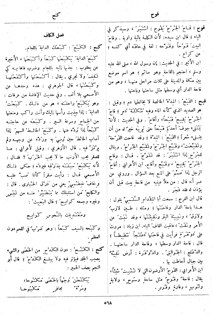 قوح: قاحَ الجُرْحُ يَقُوح: انْتَبَرَ، وَسَيُذْكَرُ فِي الْيَاءِ؛ قَالَ ابْنُ سِيدَهْ: لأَن الْكَلِمَةَ يَائِيَّةٌ وَاوِيَّةٌ. وقاحَ البيتَ قَوْحاً وقَوَّحه: لُغَةٌ فِي حاقَه أَي كَنَسَهُ؛ عَنْ كُرَاعٍ. ابْنُ الأَثير: فِي الْحَدِيثِ: