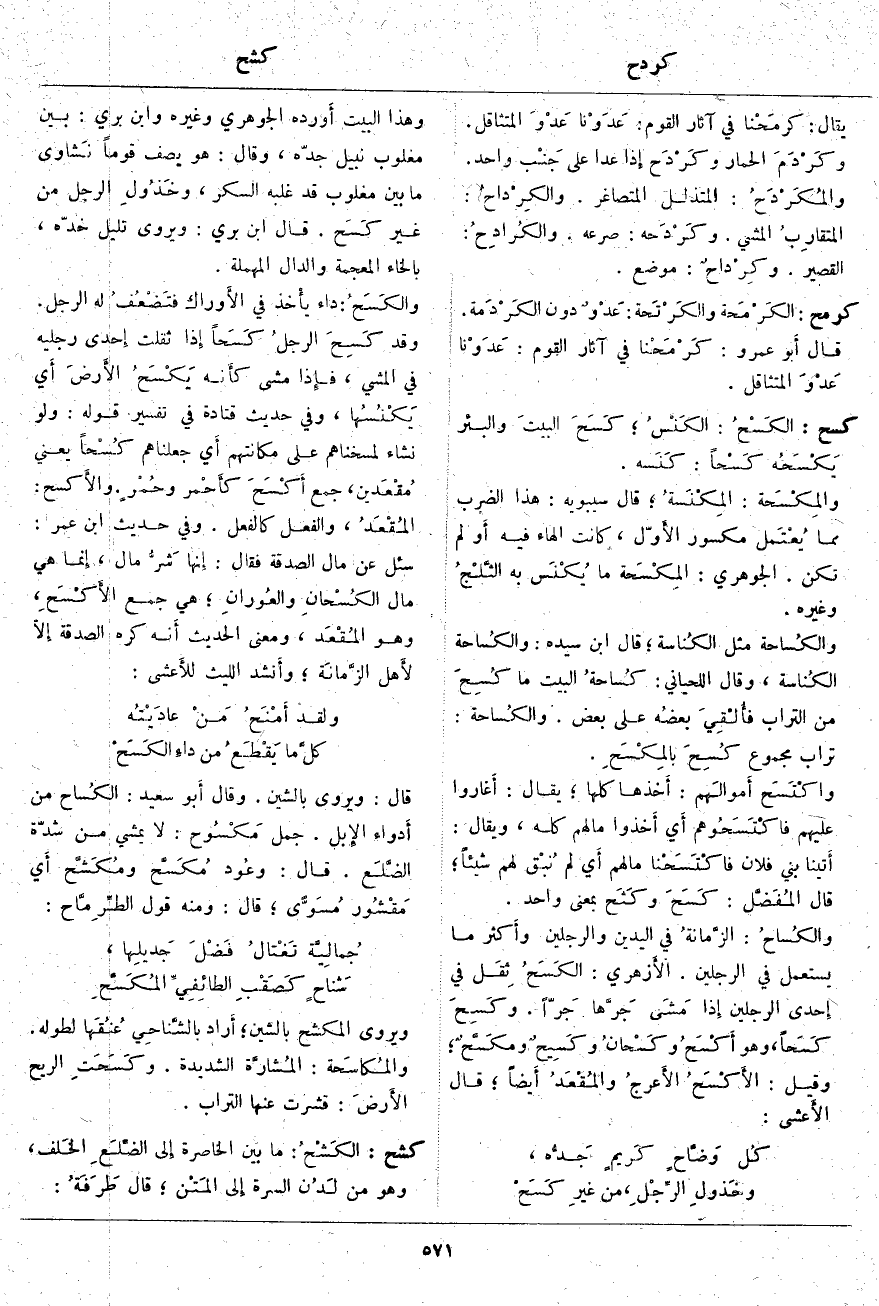 قَالَ: وَيُرْوَى بِالشِّينِ. وَقَالَ أَبو سَعِيدٍ: الكُساح مِنْ أَدواء الإِبل. جَمَلٌ مَكْسُوح: لَا يَمْشِي مِنْ شِدَّةِ الضَّلَع. قَالَ: وعُود مُكَسَّح ومُكَشَّح أَي مَقْشُور مُسَوًّى؛ قَالَ: وَمِنْهُ قَوْلُ الطِّرِمَّاح: