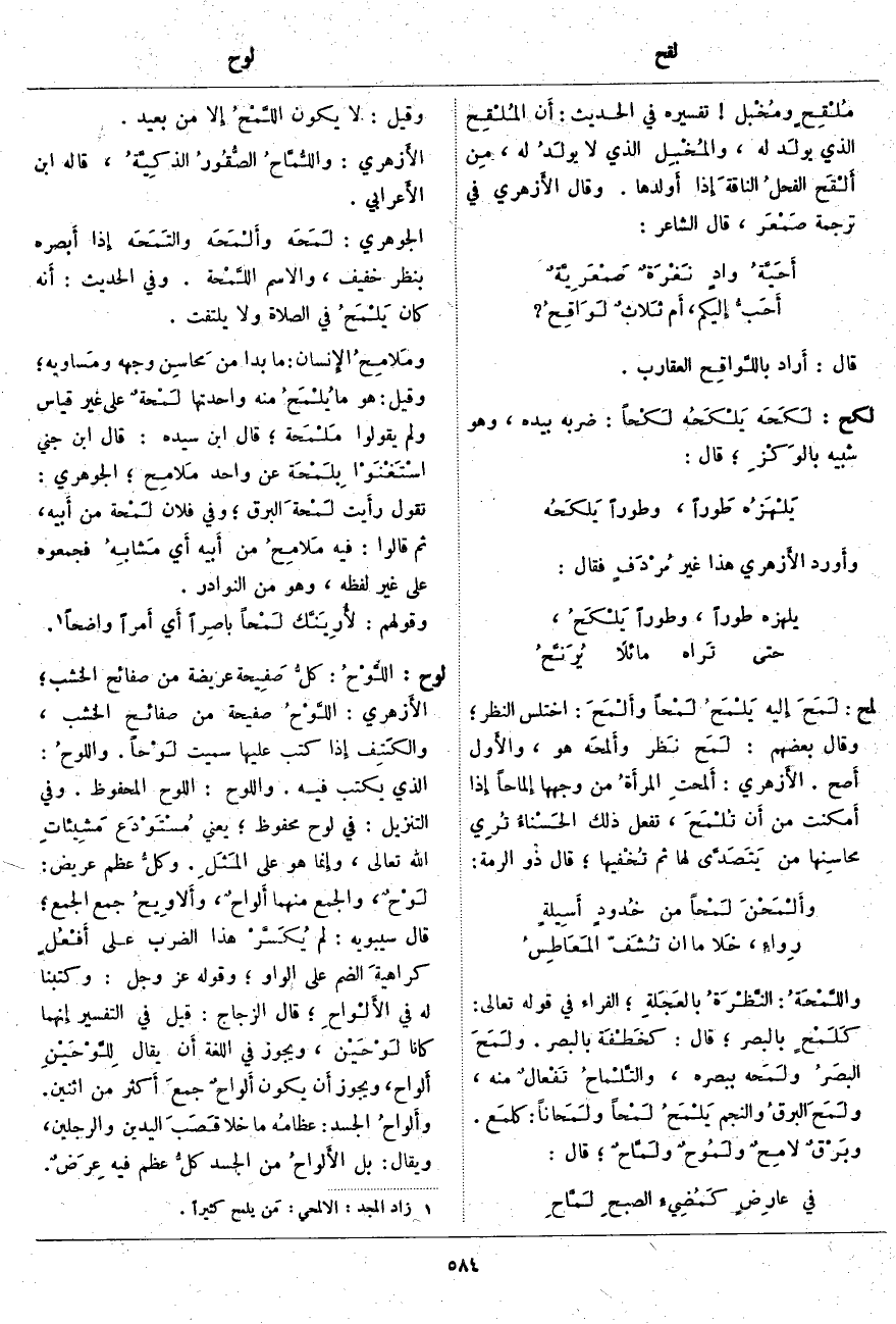 ؛ قَالَ: كخَطْفَة بِالْبَصَرِ. ولَمَحَ البصَرُ ولَمَحه بِبَصَرِهِ، والتَّلْماحُ تَفْعالٌ مِنْهُ، ولَمَحَ البرقُ وَالنَّجْمُ يَلْمَحُ لَمْحاً ولَمَحاناً: كلمَع. وبَرْقٌ لامِحٌ ولَمُوحٌ ولَمَّاحٌ؛ قَالَ: