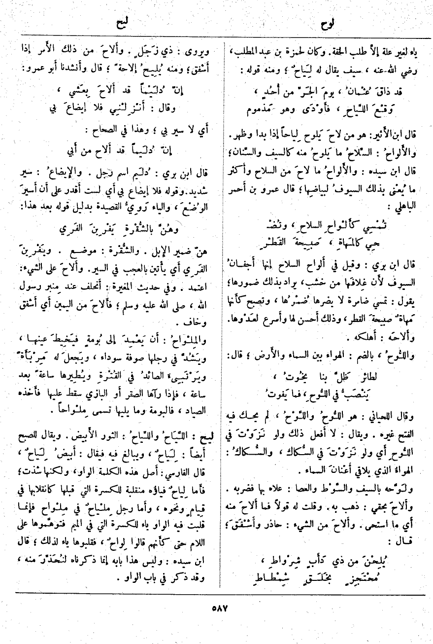 ليح: اللَّيَاحُ واللِّياحُ: الثَّوْرُ الأَبيض. وَيُقَالُ لِلصُّبْحِ أَيضاً: لَياحٌ [لِياحٌ]، وَيُبَالَغُ فِيهِ فَيُقَالُ: أَبيضُ لِياحٌ [لَياحٌ]، قَالَ الْفَارِسِيُّ: أَصل هَذِهِ الْكَلِمَةِ الْوَاوُ، وَلَكِنَّهَا شَذَّتْ؛ فأَما لِياحٌ فياؤُه مُنْقَلِبَةٌ لِلْكَسْرَةِ الَّتِي قَبْلَهَا كَانْقِلَابِهَا فِي قِيامٍ وَنَحْوِهِ، وأَما رَجُلٌ مِلْياحٌ فِي مِلْواح فإِنما قُلِبَتْ فِيهِ الْوَاوُ يَاءً لِلْكَسْرَةِ الَّتِي فِي الْمِيمِ فتوهَّموها عَلَى اللَّامِ حَتَّى كأَنهم قَالُوا لِواحٌ، فَقَلَبُوهَا يَاءً لِذَلِكَ؛ قَالَ ابْنُ سِيدَهْ: وَلَيْسَ هَذَا بَابَهُ إِنما ذَكَرْنَاهُ لنُحَذِّرَ مِنْهُ، وَقَدْ ذُكِرَ فِي بَابِ الواو.