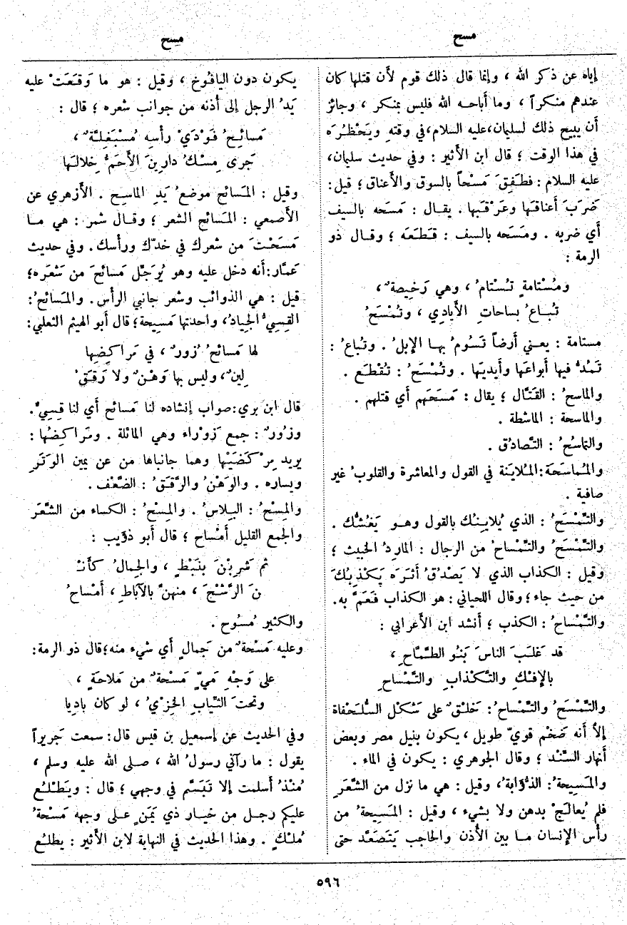؛ قِيلَ: هِيَ الذَّوَائِبُ وَشَعْرُ جَانِبَيِ الرأْس. والمَسائحُ: القِسِيُّ الجِيادُ، وَاحِدَتُهَا مَسِيحة؛ قَالَ أَبو الْهَيْثَمِ الثَّعْلَبِيِّ: