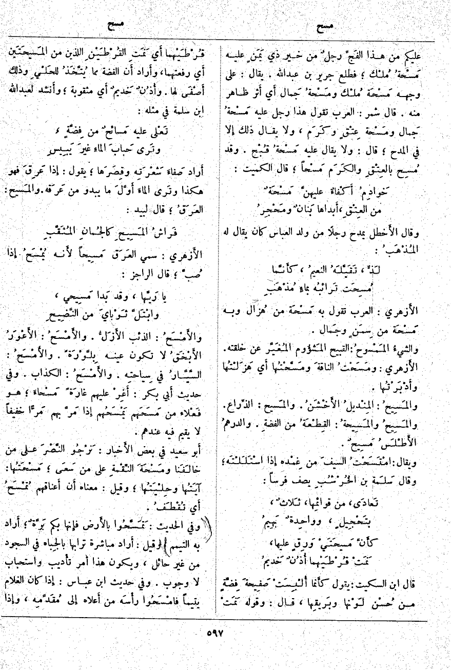 الأَزهري: سُمِّيَ العَرَق مَسِيحاً لأَنه يُمْسَحُ إِذا صُبَّ؛ قَالَ الرَّاجِزُ: