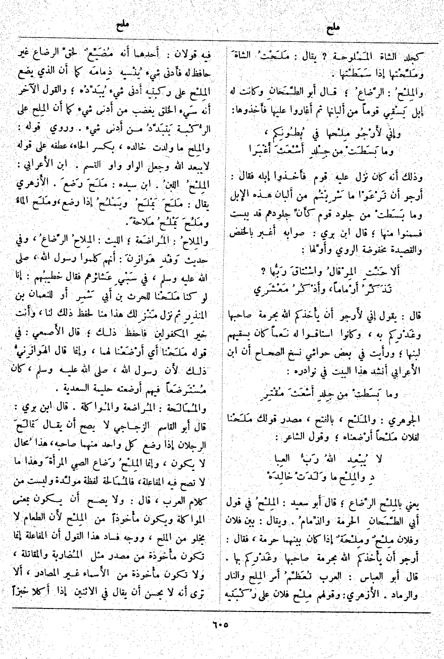 ؛ قَالَ الأَصمعي: فِي قَوْلِهِ مَلَحْنا أَي أَرْضَعْنا لَهُمَا، وإِنما قَالَ الهَوازِنيُّ ذَلِكَ لأَن رَسُولَ اللَّهِ، صَلَّى اللَّهُ عَلَيْهِ وَسَلَّمَ، كَانَ مُسْتَرضَعاً فِيهِمْ أَرضعته حَلِيمَةُ السَّعْدِيَّةُ. والمُمَالَحة: المُراضعة والمُواكلة. قَالَ ابْنُ بَرِّيٍّ: قَالَ أَبو الْقَاسِمِ الزَّجَّاجِيُّ لَا يَصِحُّ أَن يُقَالَ تَمالَحَ الرَّجُلَانِ إِذا رَضَعَ كُلُّ وَاحِدٍ مِنْهُمَا صَاحِبَهُ، هَذَا مُحال لَا يَكُونُ، وإِنما المِلْحُ رَضاع الصَّبِيِّ المرأَةَ وَهَذَا مَا لَا تَصِحُّ فِيهِ الْمُفَاعَلَةُ، فالمُمَالحة لَفْظَةٌ مولَّدة وَلَيْسَتْ مِنْ كَلَامِ الْعَرَبِ، قَالَ: وَلَا يَصِحُّ أَن يَكُونَ بِمَعْنَى الْمُوَاكَلَةِ وَيَكُونُ مأْخوذاً مِنَ المِلْح لأَن الطَّعَامَ لَا يَخْلُو مِنَ الْمِلْحِ، وَوَجْهُ فَسَادِ هذا القول أَن الْمُفَاعَلَةَ إِنما تَكُونُ مأْخوذة مِنْ مَصْدَرٍ مِثْلِ المُضاربة وَالْمُقَاتَلَةِ، وَلَا تَكُونُ مأْخوذة مِنَ الأَسماء غَيْرَ الْمَصَادِرِ، أَلا تَرَى أَنه لَا يَحْسُنُ أَن يُقَالَ فِي الِاثْنَيْنِ إِذا أَكلا خُبْزًا
