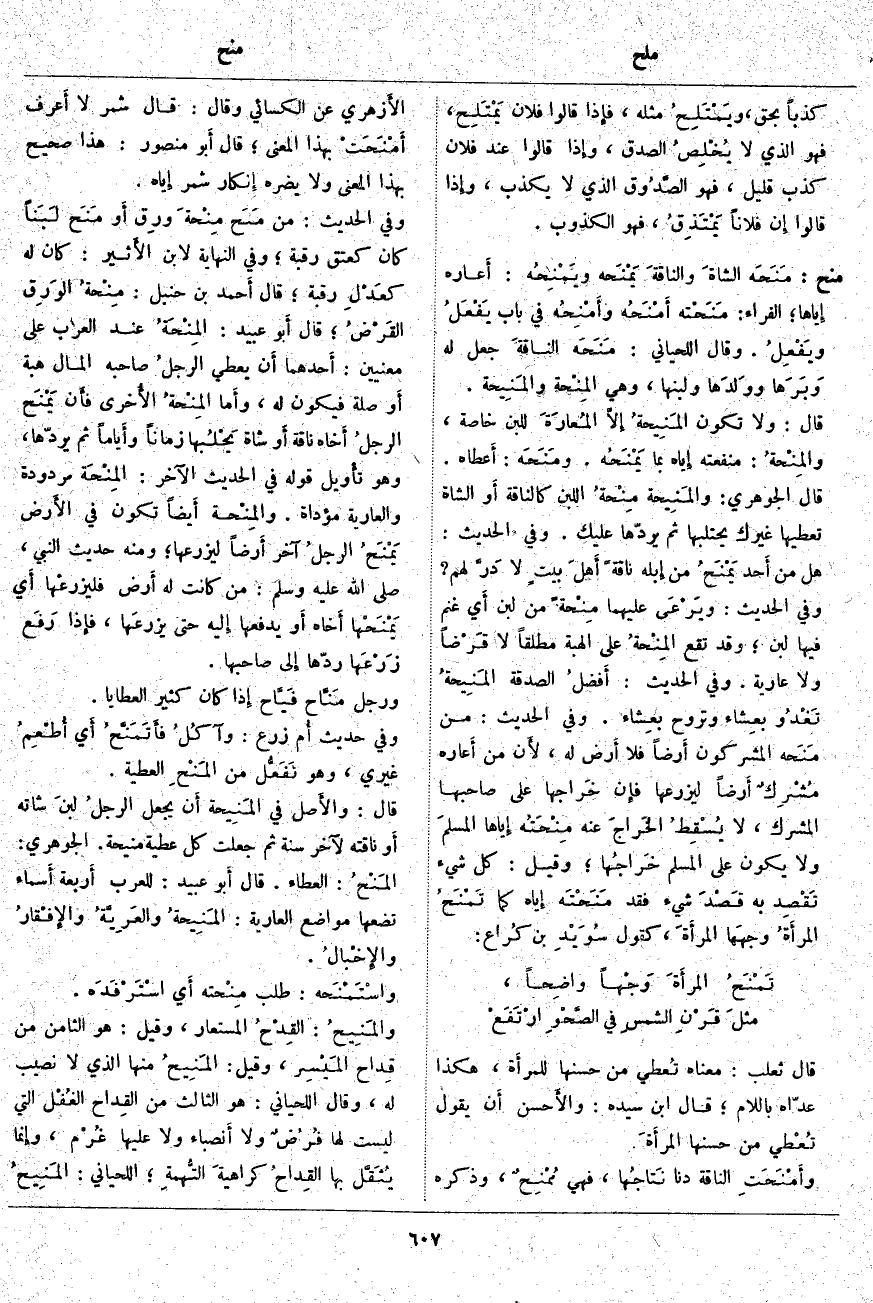 منح: مَنَحَه الشاةَ والناقَةَ يَمْنَحه ويَمْنِحُه: أَعاره إِياها؛ الفراء: مَنَحْته أَمْنَحُه وأَمْنِحُه فِي بَابِ يَفْعَلُ ويَفْعِلُ. وَقَالَ اللِّحْيَانِيُّ: مَنَحَه الناقةَ جَعَلَ لَهُ وَبَرَها ووَلدَها وَلَبَنَهَا، وَهِيَ المِنْحة والمَنِيحة. قَالَ: وَلَا تَكُونُ المَنِيحةُ إِلَّا المُعارَةَ لِلَّبَنِ خَاصَّةً، والمِنْحةُ: مَنْفَعَتُهُ إِياه بِمَا يَمْنَحُه. ومَنَحَه: أَعطاه. قَالَ الْجَوْهَرِيُّ: والمَنِيحة مِنْحةُ اللَّبَنِ كَالنَّاقَةِ أَو الشَّاةِ تُعْطِيهَا غَيْرَكَ يَحْتَلِبُهَا ثُمَّ يَرُدُّهَا عَلَيْكَ. وَفِي الْحَدِيثِ:
