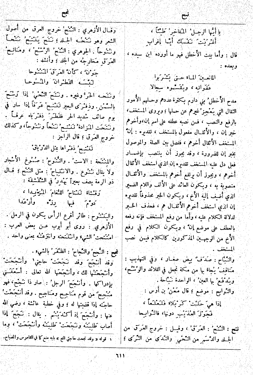 نجح: النُّجحُ والنَّجاحُ: الظَّفَرُ بالشيءِ. وَقَدْ أَنْجَحَ وَقَدْ نَجَحَتْ حَاجَتِي «4» وأَنْجَحَتْ وأَنْجَحْتُها لَكَ، وأَنْجَحَها اللَّهُ تَعَالَى: أَسْعَفَني بإِدراكها. وأَنْجَحَ الرجلُ: صَارَ ذَا نُجْح، فَهُوَ مُنْجِحٌ مِنْ قَوْمٍ مَناجِح ومَناجِيح. وَقَدْ أَنْجَحْتُ حاجَته إِذا قَضَيْتَهَا لَهُ؛ وَفِي خُطْبَةِ