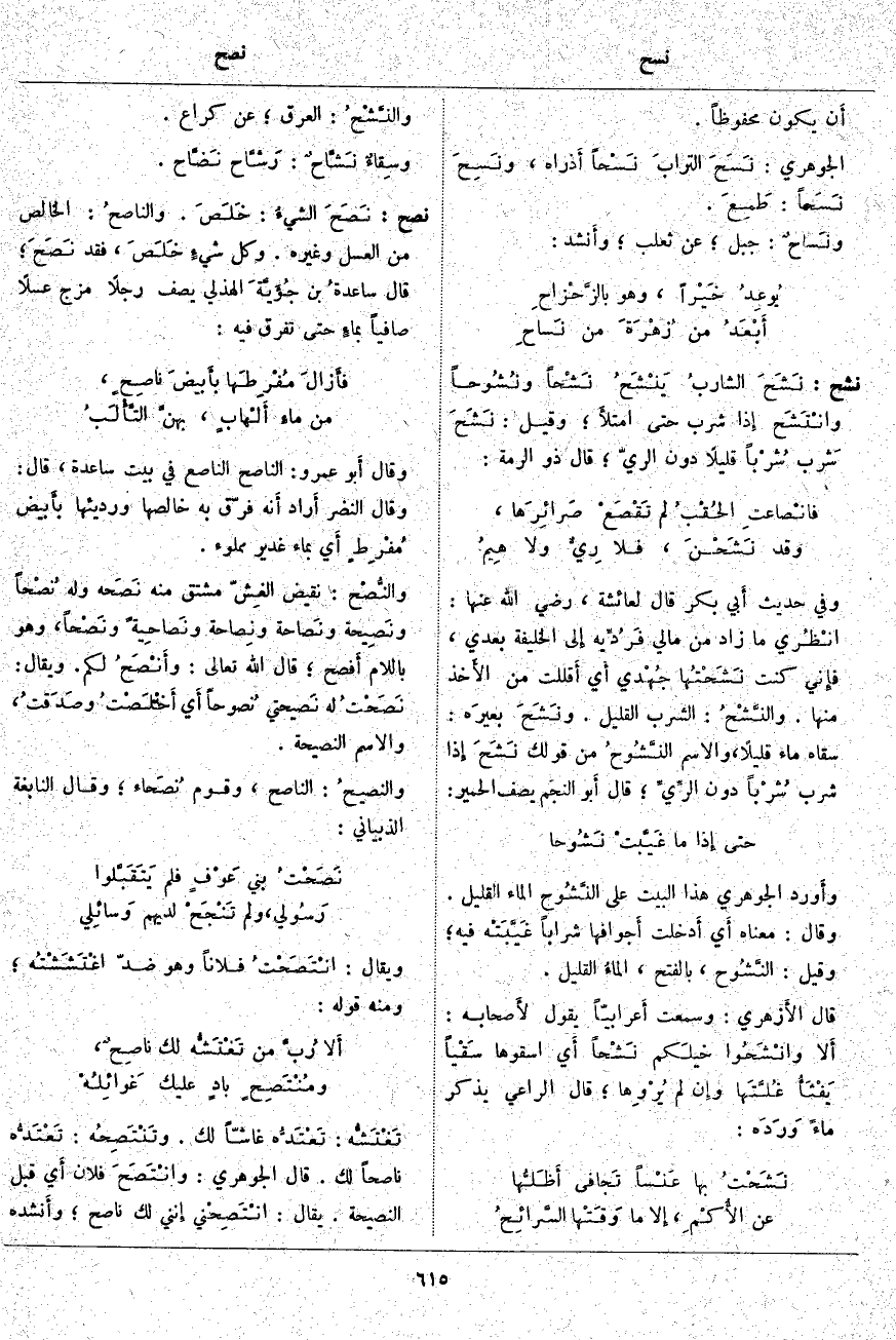 نصح: نَصَحَ الشيءُ: خَلَصَ. والناصحُ: الْخَالِصُ مِنَ الْعَسَلِ وَغَيْرِهِ. وَكُلُّ شيءٍ خَلَصَ، فَقَدْ نَصَحَ؛ قَالَ ساعدةُ بْنُ جُؤَيَّةَ الْهُذَلِيُّ يَصِفُ رَجُلًا مَزَجَ عَسَلًا صَافِيًا بماءٍ حَتَّى تَفَرَّقَ فِيهِ: