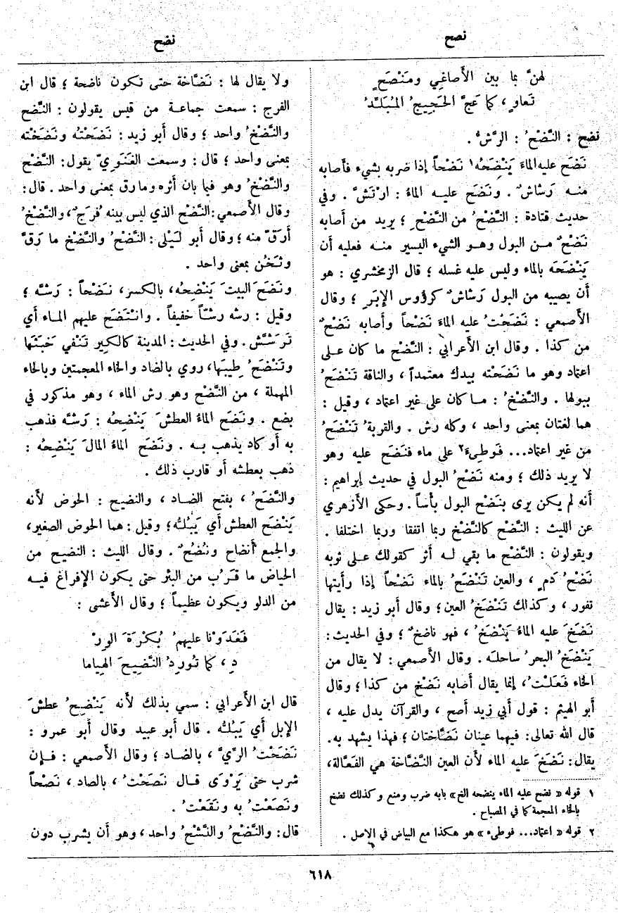 ، رُوِيَ بِالضَّادِ وَالْخَاءِ الْمُعْجَمَتَيْنِ وَبِالْحَاءِ الْمُهْمَلَةِ، مِنَ النَّضْح وَهُوَ رَشُّ الْمَاءِ، وَهُوَ مَذْكُورٌ فِي بَضَعَ. ونَضَح الماءُ العطشَ يَنْضِحُه: رَشَّه فَذَهَبَ بِهِ أَو كَادَ يَذْهَبُ بِهِ. ونَضَح الماءُ المالَ يَنْضِحُه: ذَهَبَ بِعَطَشِهِ أَو قَارَبَ ذَلِكَ. والنَّضَحُ، بِفَتْحِ الضَّادِ، وَالنَّضِيحُ: الْحَوْضُ لأَنه يَنْضَح الْعَطَشَ أَي يَبُلُّه؛ وَقِيلَ: هُمَا الْحَوْضُ الصَّغِيرُ، وَالْجَمْعُ أَنضاح ونُضُحٌ. وَقَالَ اللَّيْثُ: النَّضِيحُ مِنَ الْحِيَاضِ مَا قَرُب مِنَ الْبِئْرِ حَتَّى يَكُونَ الإِفراغ فِيهِ مِنَ الدَّلْوِ وَيَكُونُ عَظِيمًا؛ وَقَالَ الأَعشى: