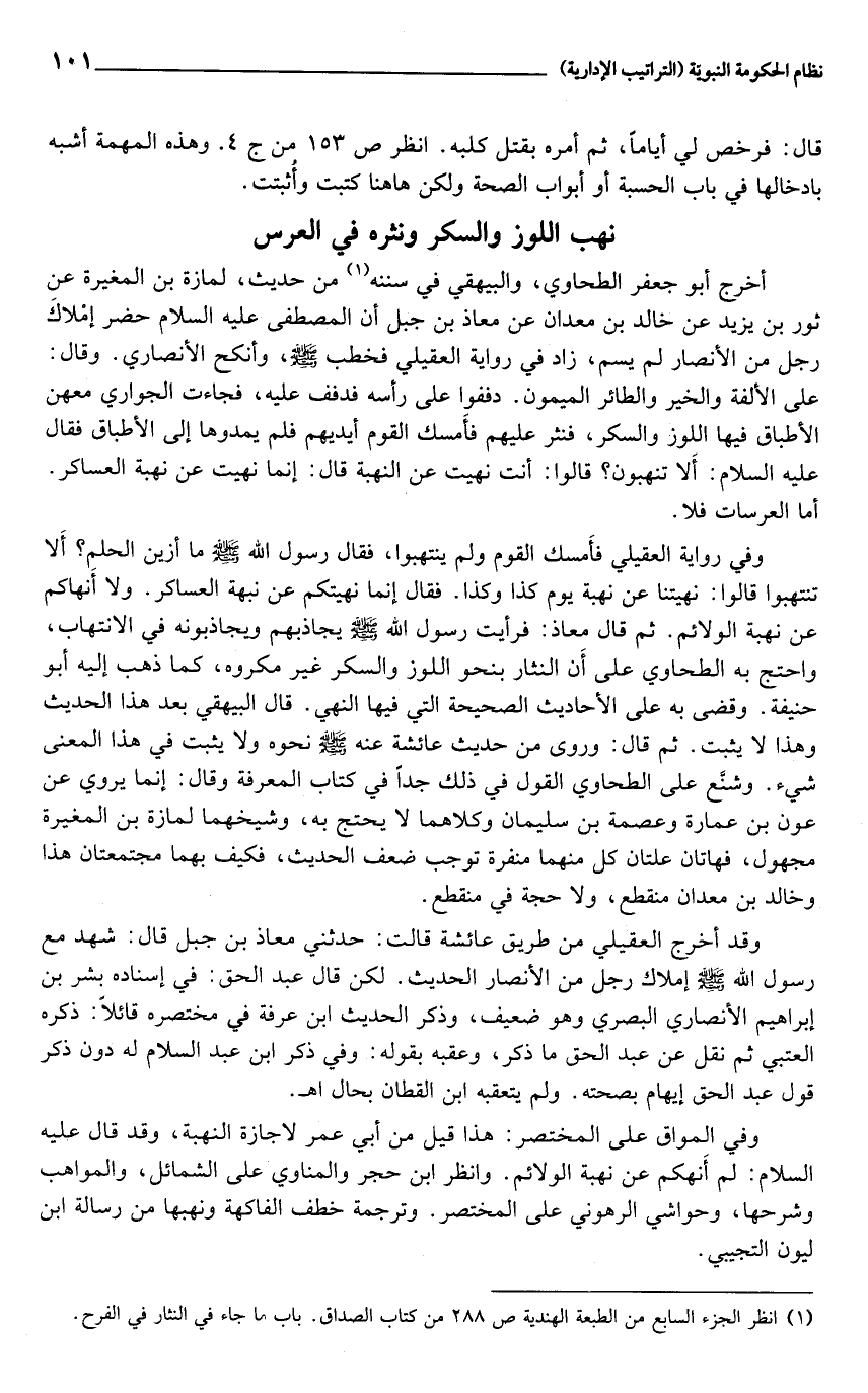 (1) انظر الجزء السابع من الطبعة الهندية ص 288 من كتاب الصداق. باب ما جاء في النثار في الفرح.